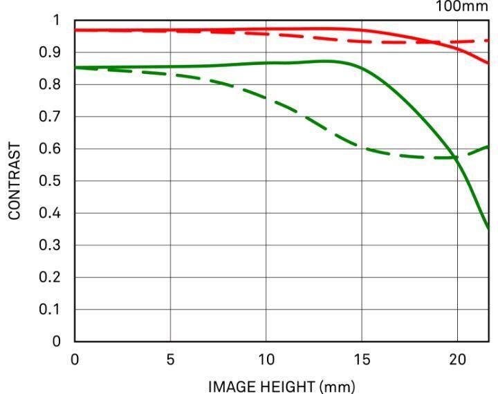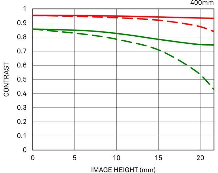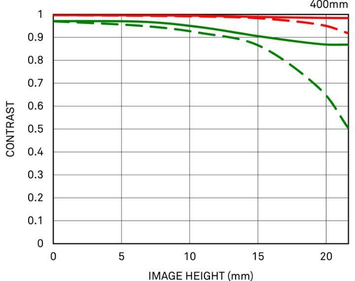 Die Messungen bei 10 Linien pro Millimeter zeigen die Kontrastleistung des Objektivs (rote Linien), während feine, wiederholte parallele Linien mit einem Abstand von 30 Linien pro Millimeter die Auflösungsleistung des Objektivs (grüne Linien) bei Offenblende darstellen.