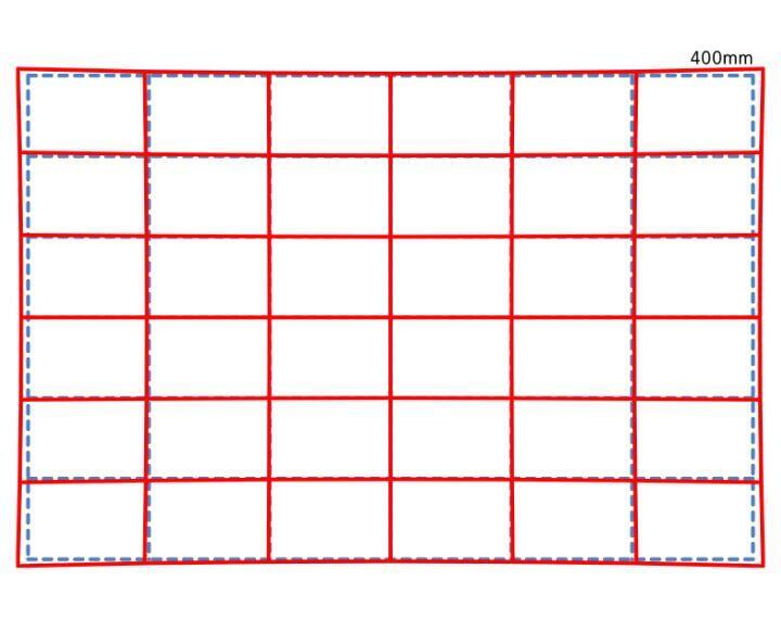 Wenn Sie ein Foto eines Gittermusters aufnehmen, erscheint dieses wie durch die blaue gestrichelte Linie dargestellt. Die rote Linie zeigt, wie das Gittermuster im tatsächlichen Bild erscheint, wenn die objektivbedingte Verzeichnung berücksichtigt wird.