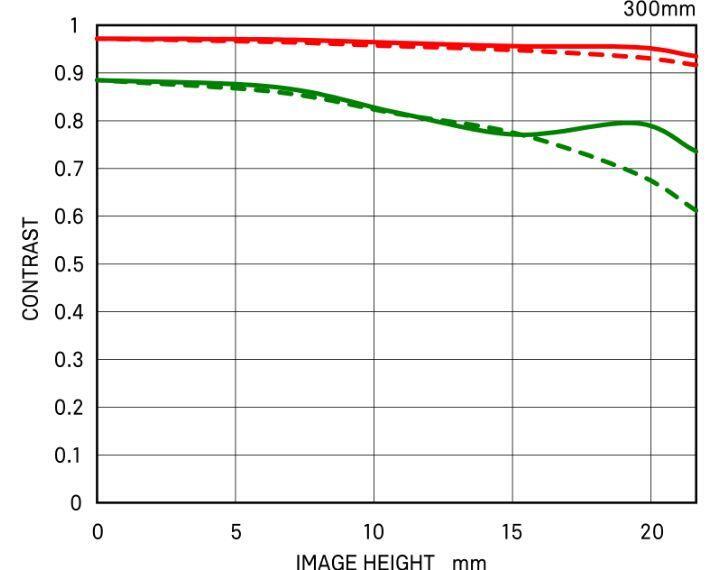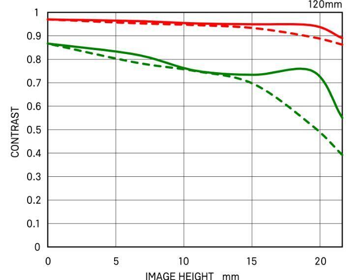 Die Messwerte bei 10 Linien pro Millimeter geben die Kontrastfähigkeit des Objektivs an (rote Linien), wiederholte feine Linienpaare mit einem Abstand von 30 Linien pro Millimeter messen die Schärfefähigkeit des Objektivs (grüne Linien), jeweils bei vollständig geöffneter Blende.