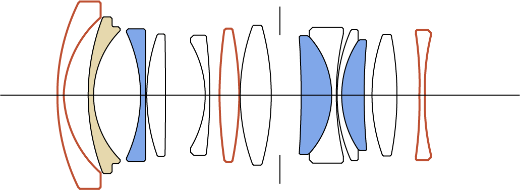 15 Elemente in 11 Gruppen, darunter 1 FLD-, 1 ELD-, 2 SLD- und 2 asphärische Elemente.