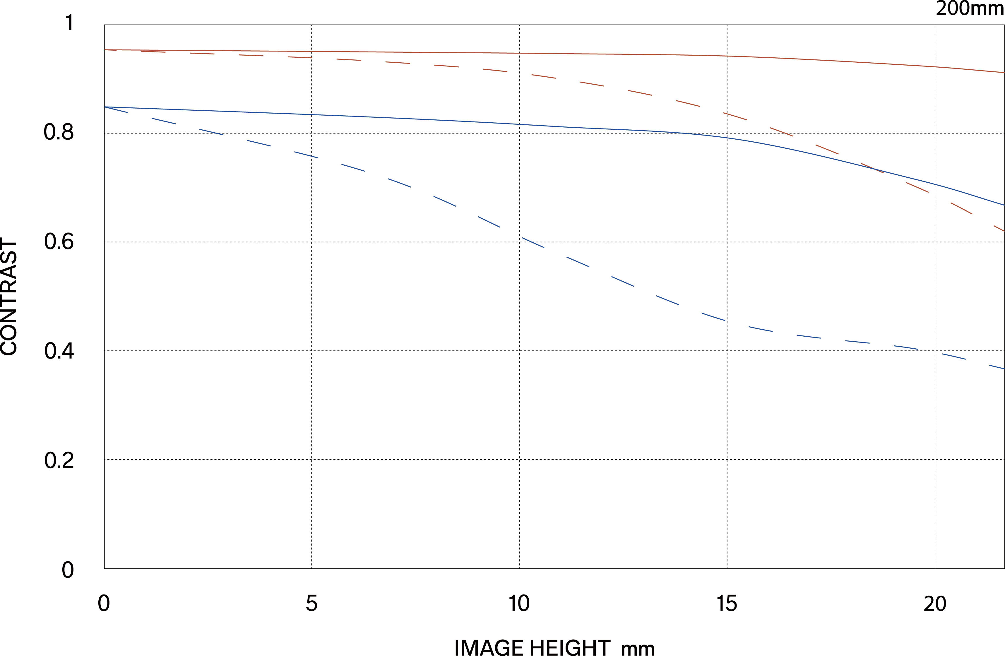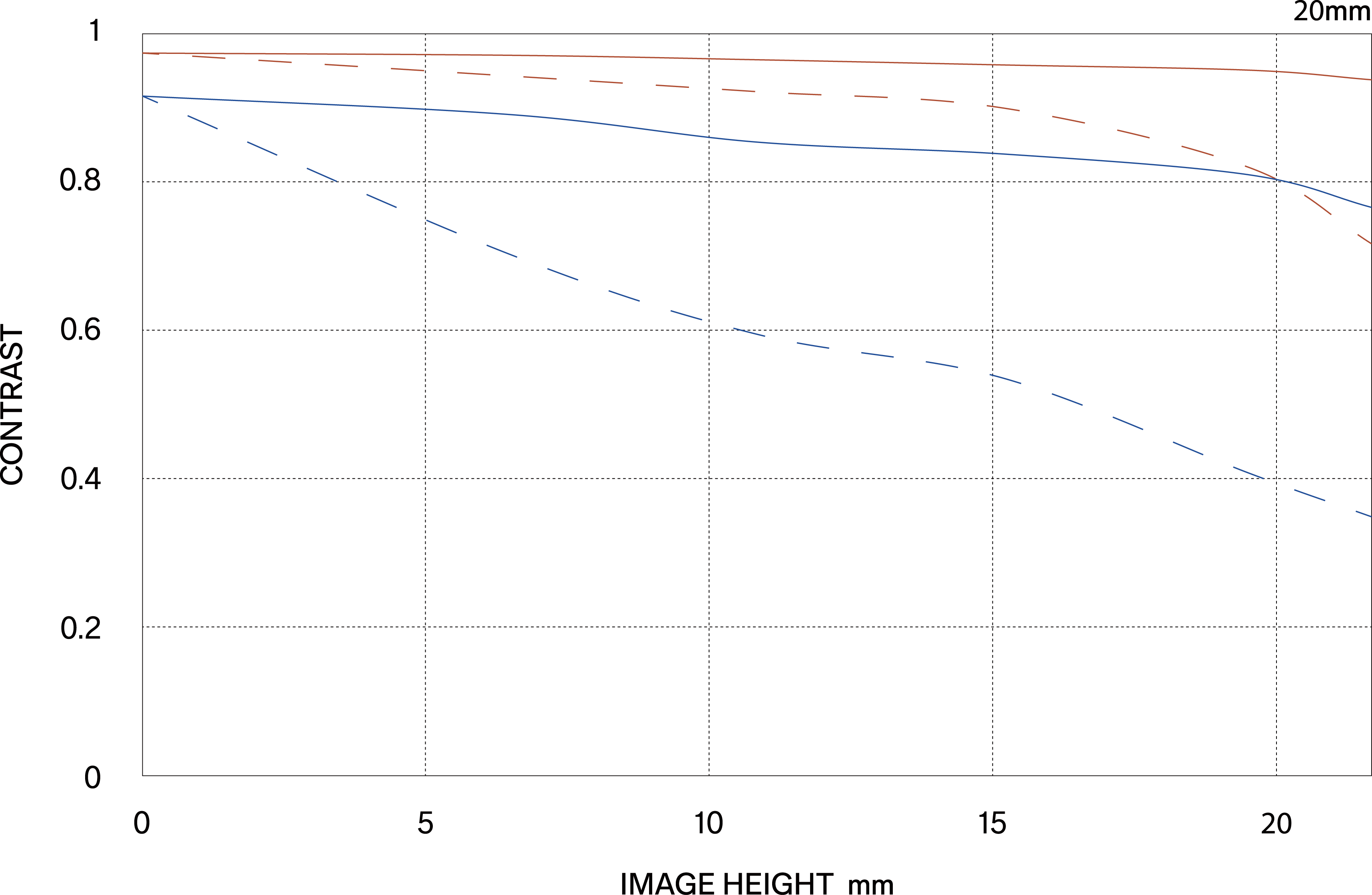 Die Messwerte bei 10 Linien pro Millimeter zeigen die Kontrastfähigkeit des Objektivs (rote Linien), während feine, sich wiederholende parallele Linien mit einem Abstand von 30 Linien pro Millimeter die Schärfefähigkeit des Objektivs messen (grüne Linien), jeweils bei vollständig geöffneter Blende.