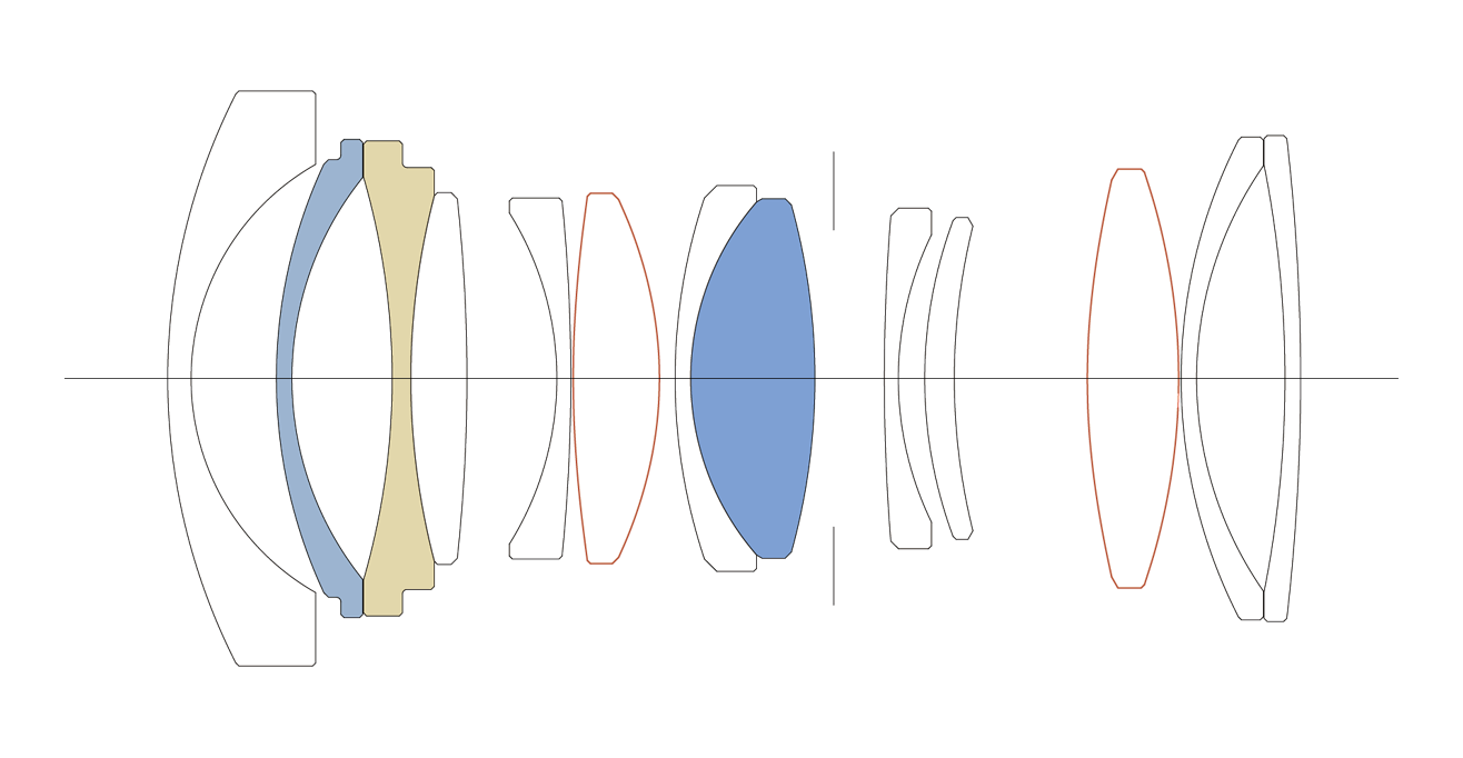 Das Objektiv nutzt zwei SLD Glaselemente und ein FLD Glaselement zur Korrektur der axialen chromatischen Aberration, die bei lichtstarken Objektiven besonders ins Gewicht fällt. Zudem kommen zwei hochpräzise glasgeformte asphärische Elemente zum Einsatz, ermöglicht durch die Fertigungstechnologie von Sigmas einziger Produktionsstätte in Aizu. Dadurch konnte die Gesamtzahl der Linsenelemente niedrig gehalten sowie Größe und Gewicht reduziert werden, während verschiedene Abbildungsfehler dennoch hervorragend korrigiert werden.