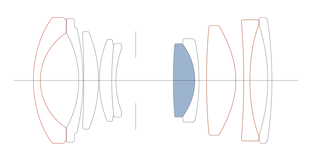 Objektivkonstruktion: 10 Elemente in 8 Gruppen, mit 1 SLD glass und 3 asphärischen Linsen