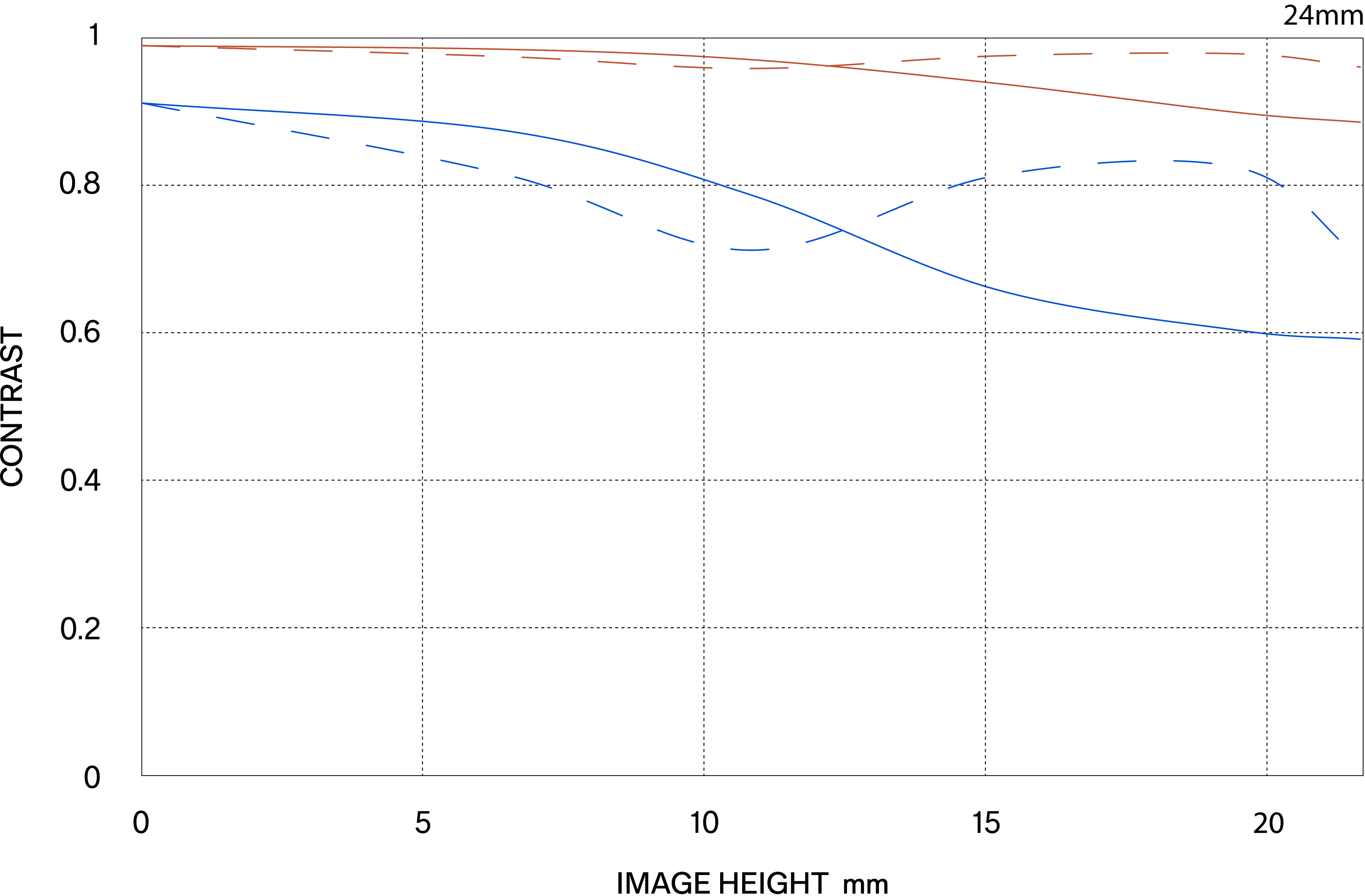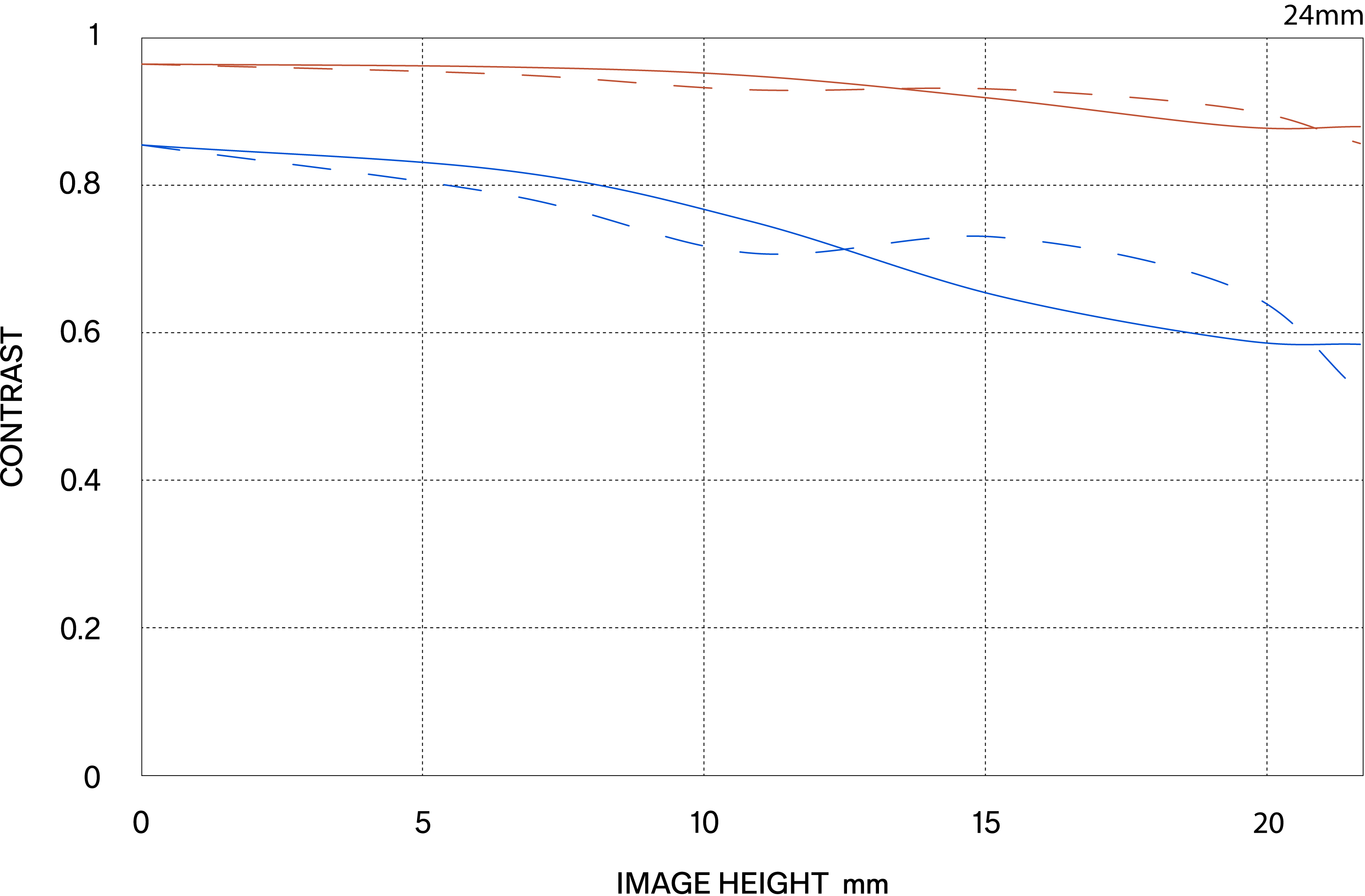 Die MTF Modulation Transfer Function ist eine der Messgrößen zur Bewertung der Leistungsfähigkeit eines Objektivs und zeigt, wie originalgetreu der Kontrast eines Motivs auf der Bildebene wiedergegeben wird. Die horizontale Achse stellt die Bildhöhe dar, also den Abstand vom Bildzentrum in Millimetern, und die vertikale Achse den Kontrastwert, dessen Maximalwert 1 beträgt.