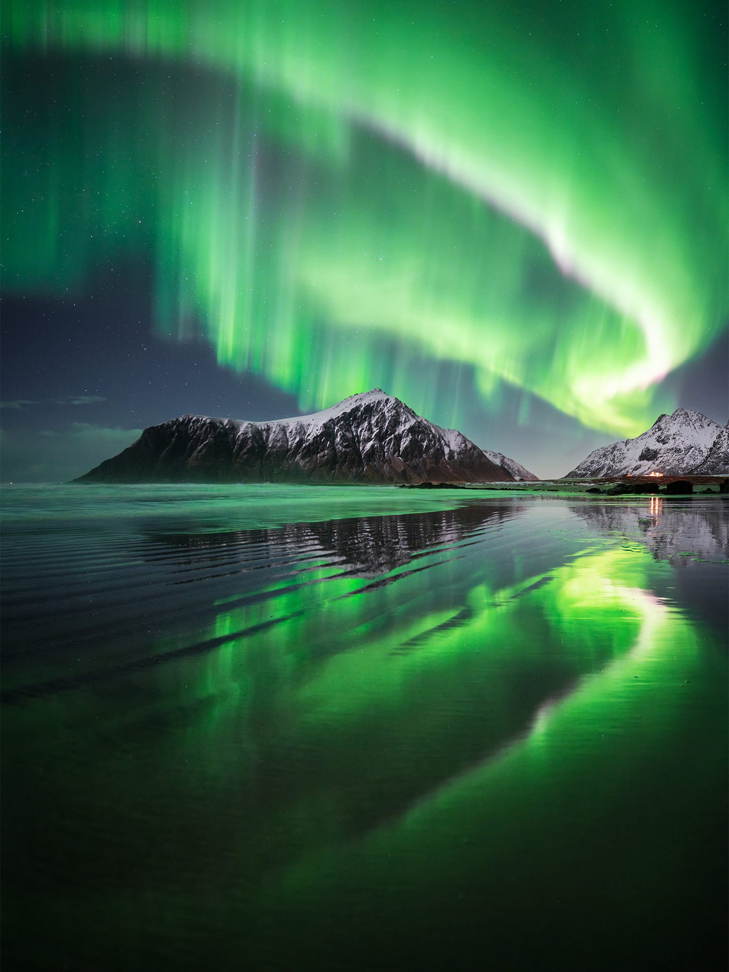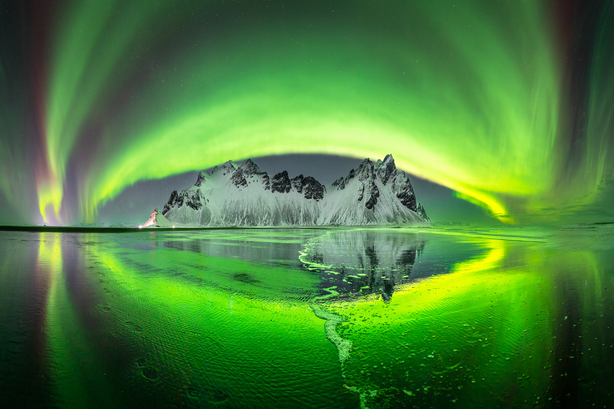 Ich genoss so sehr die Zeit, die dynamischen Nordlichter am Strand mit der schnellen Linse zu fotografieren, dass ich mich entschied, direkt im Anschluss nach Island zu reisen. Dort begab ich mich zum Vestrahorn, einem markanten Berg auf Ostisland mit vorgelagertem Strand. Hier hatte ich erneut Glück mit den Nordlichtern und konnte die Panoramafotografie mit der unglaublich schnellen Linse an die Spitze treiben. Nach einem einreihigen Panorama, bei dem die Nordlichter trotz 14mm und Panorama nicht komplett eingefangen werden konnten, entschied ich mich, ein dreireihiges Panorama, bestehend aus 15 Einzelfotos mit einer Belichtungszeit von 2.5 Sekunden, aufzunehmen. Das klingt unglaublich, wenn man bedenkt, dass man nur wenig Zeit hat, bis die nächste Welle kommt, und das während der Nacht. Aber mit dem 14mm und viel Probieren sowie nassen Füßen ist es mir schlussendlich gelungen. Das zusammengefügte Panorama zeigt die gesamten Nordlichter über dem Vestrahorn und die reflektierten Nordlichter am Strand im Vordergrund. Phänomenal! Wie bereits erwähnt, ist die Linse ein purer Genuss, weil man wieder mehr Zeit mit dem Probieren, also dem Fotografieren, verbringt.
