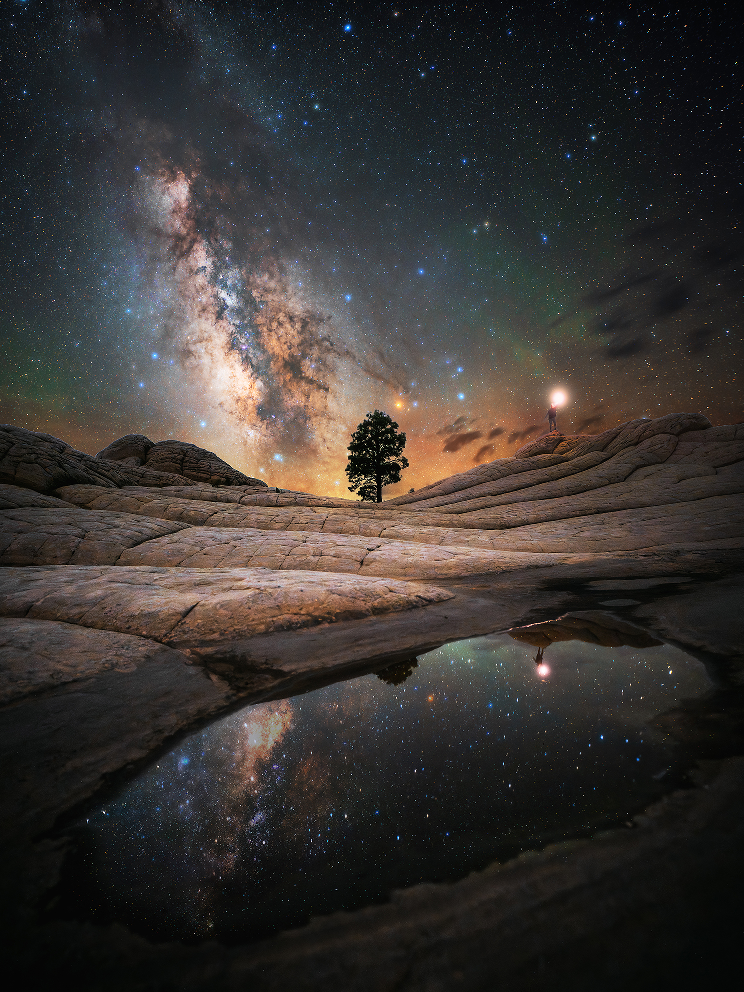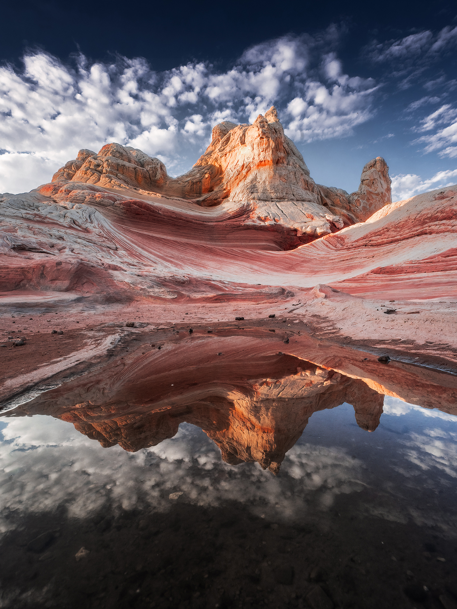 Im Anschluss habe ich die Linse auf einen Ausflug nach White Pocket in Arizona, USA, mitgenommen. White Pocket ist eine faszinierende geologische Formation, die einen absoluten Traum für die Landschaftsfotografie darstellt. Mit der Linse konnte ich dank des ultraweiten Bildwinkels von 114.2° das erste Licht auf White Pocket mit der gleichzeitigen Reflexion in einer Pfütze aufnehmen. Zusätzlich ließ sich auch die Landschaft während der Nacht eindrucksvoll festhalten. Dabei steht das Milchstraßenzentrum über einer abstrakten Felsformation und wird auch wieder in einer Pfütze reflektiert.