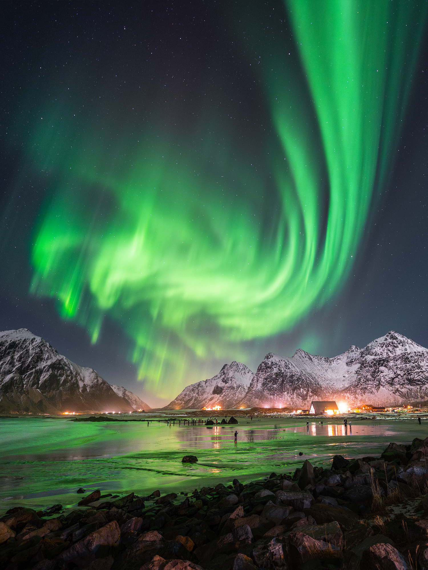Angefangen hat das Abenteuer auf den Lofoten. Zu Beginn des Jahres reiste ich nach Nordnorwegen, um auf Fotoreisen zusammen mit meinen Teilnehmern Nordlichter zu jagen. Am Strand von Skagsanden hatten wir Glück, und das Potenzial der Linse zeigte sich. Schon die Testaufnahme, um überhaupt zu sehen, wie sich die Nordlichter bewegen, überzeugt. Mit einer offenen Blende von F1.4 können kurze Belichtungszeiten, hier von 2.5 Sekunden, realisiert werden, was zum „Einfrieren“ der dynamischen Nordlichter führt. Würde man länger belichten, wären die Strukturen unscharf. Selbst mit Blende F1.4 ist die Aufnahme über die Nordlichter bis zum Vordergrund scharf abgebildet, und die Vignettierung hält sich in Grenzen.