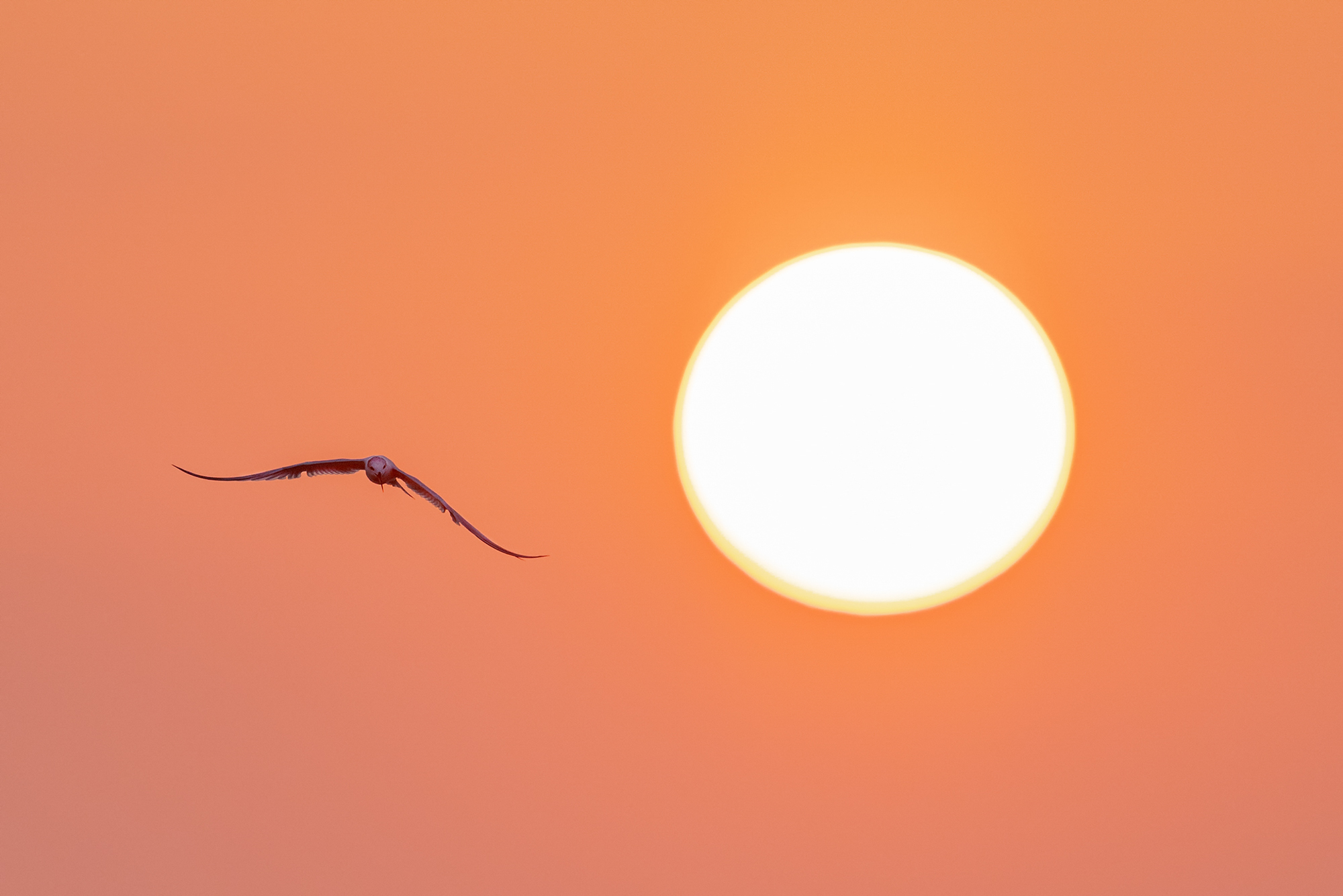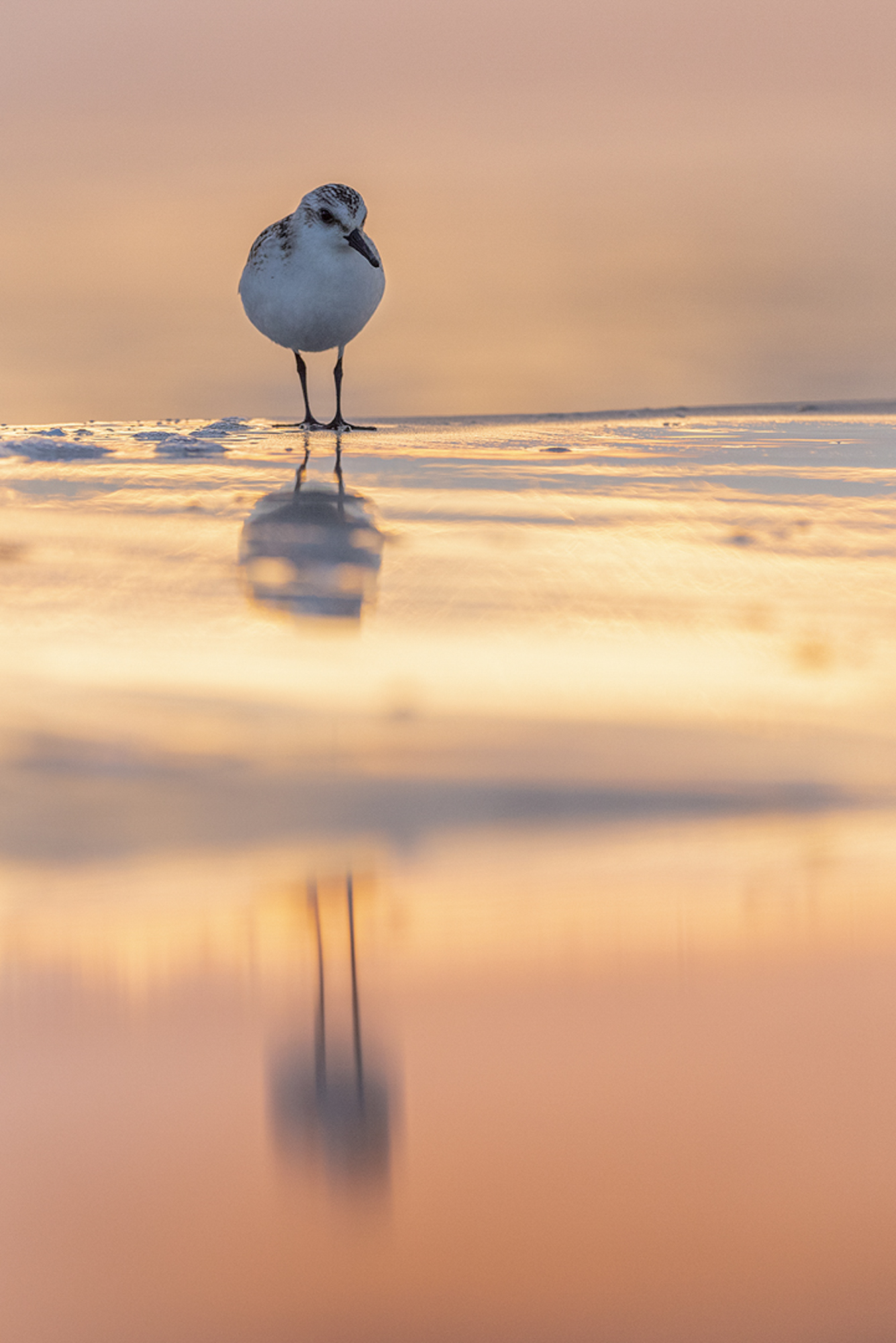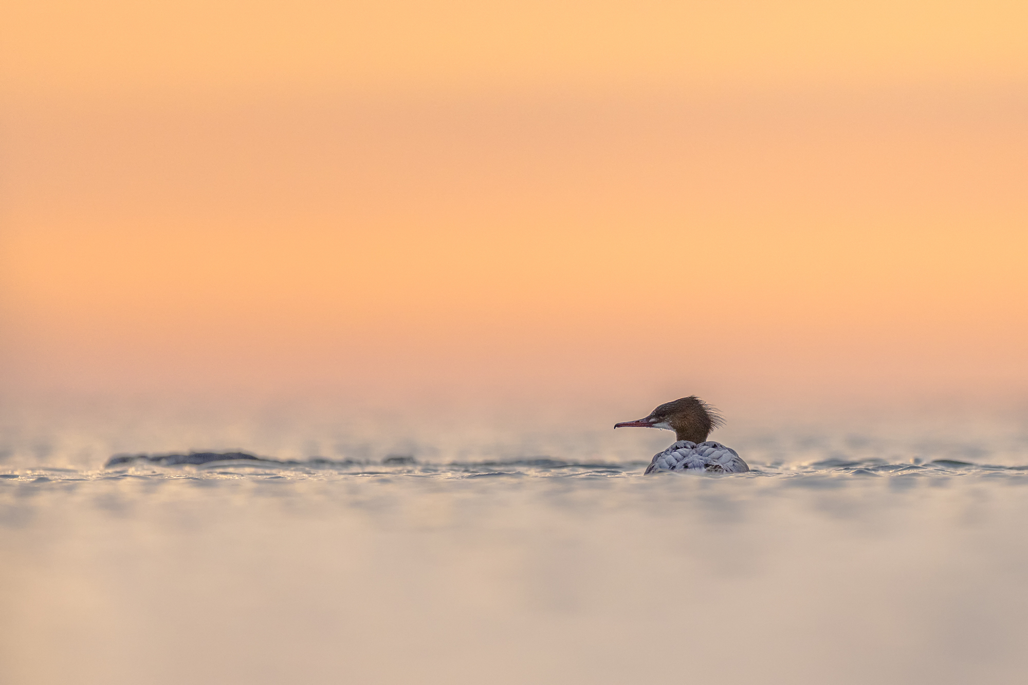 Nicht immer war es möglich sich so zu positionieren, dass die Vögel sich im Gegenlicht befanden, so wie bei einem Sandregenpfeifer im weißen Strandsand, oder dem Gänsesäger vor dem orangen gefärbten Morgenhimmel. Aber dank der ebenfalls sehr tiefen Kameraposition verschwimmt sowohl der Vorder- als auch der Hintergrund und das Motiv sticht wunderbar heraus. Dank des weißen Strandsandes, sah es fast so aus, als würde der kleine Sandregenpfeifer durch den Schnee laufen.