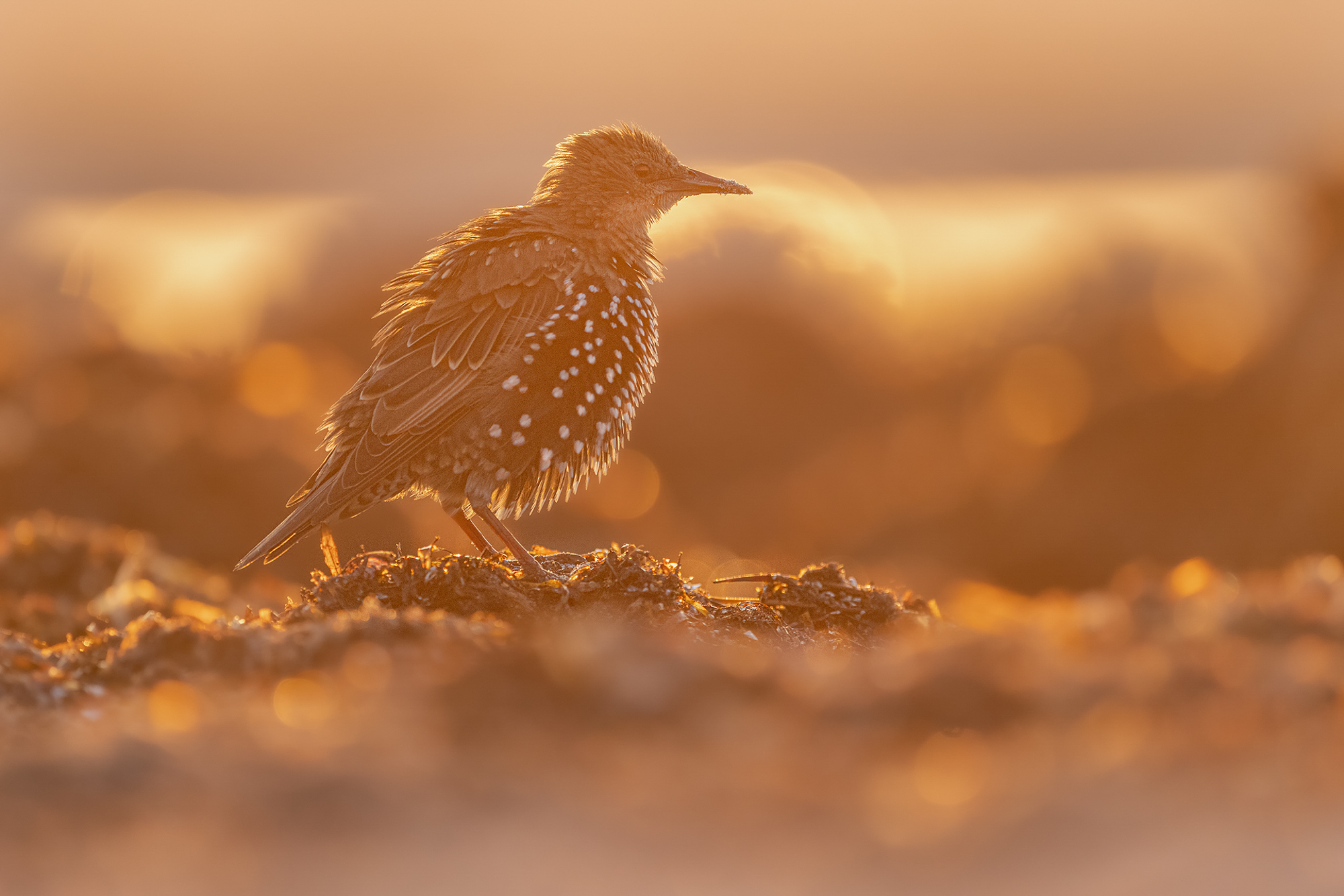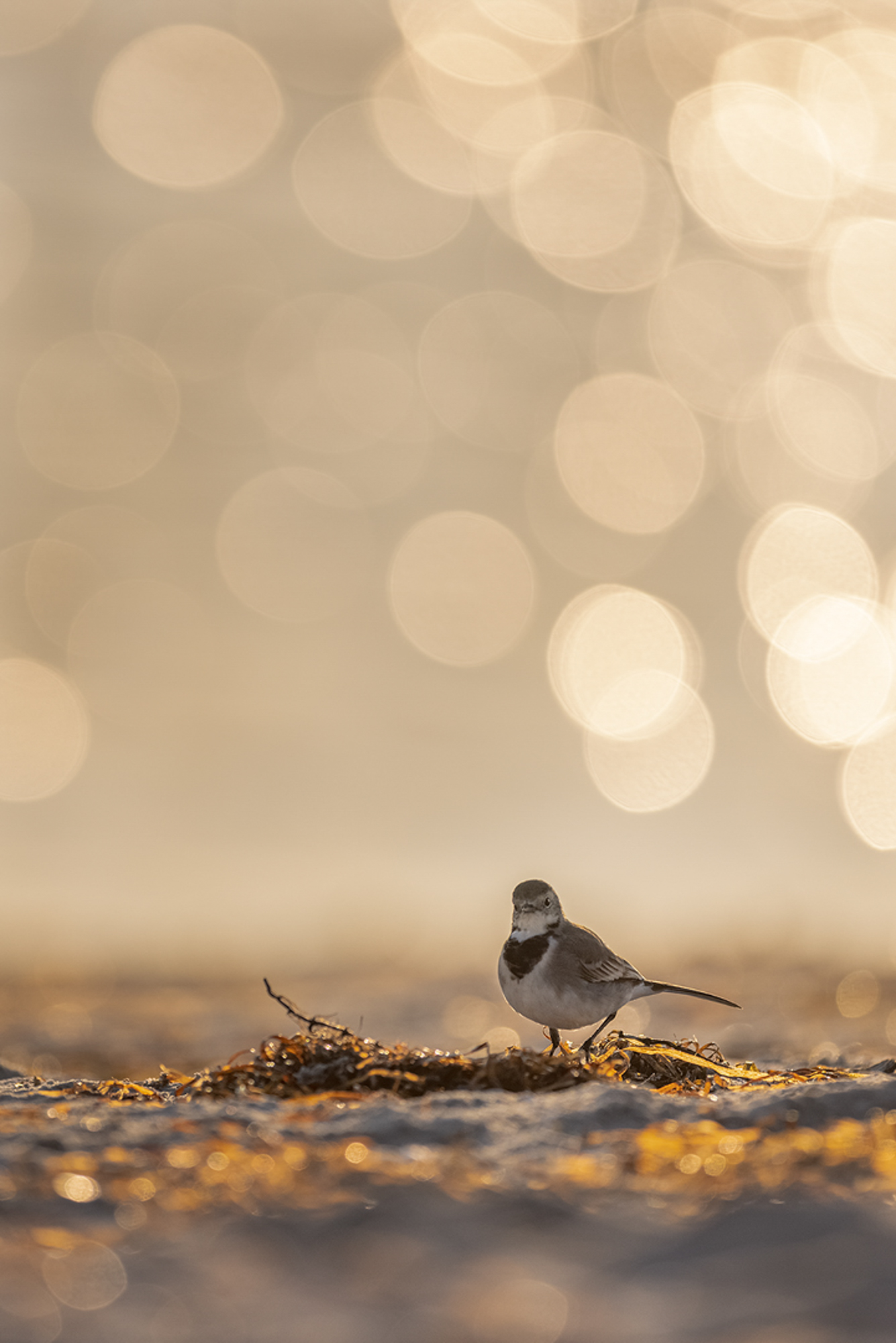 Mein Lieblingsbereich ist aber ganz klar Prerowstrand, der sich von Prerow bis hin zum Nothafen zieht. Wir haben mit unserem Wohnwagen auf dem Campingplatz inmitten der Dünen gecampt. Selbst im September war es noch so warm, dass ich ganz bequem morgens zum Sonnenaufgang in kurzen Hosen und Barfuß aus dem Wohnwagen stolpern und mit meiner Kamera den Strand entlang spazieren konnte. Auf dem ganzen Strandabschnitt sieht man dank des Vogelzugs allerlei verschiedene Arten. Da ich in meinen Fotos sehr gerne Bokeh verwende, waren die Bedingungen für mich dort ideal, denn die Sonne war mir ein ums andere Mal gnädig. Eine Art Bokeh zu erzeugen ist es nämlich, die sich im Wasser reflektierende Sonne zu nutzen. Gegenlicht und eine tiefe Kameraposition sind dafür also ein Muss, wenn die Sonne noch tief steht. Und so konnte ich die ganzen Durchzügler ganz einfach in Szene setzen. Seien es ein paar Goldammern auf den Dünengräsern, oder einfach nur ein Star, der in den Algen sein Frühstück sucht. Selbst eine gewöhnliche Bachstelze macht im richtigen Licht etwas her.