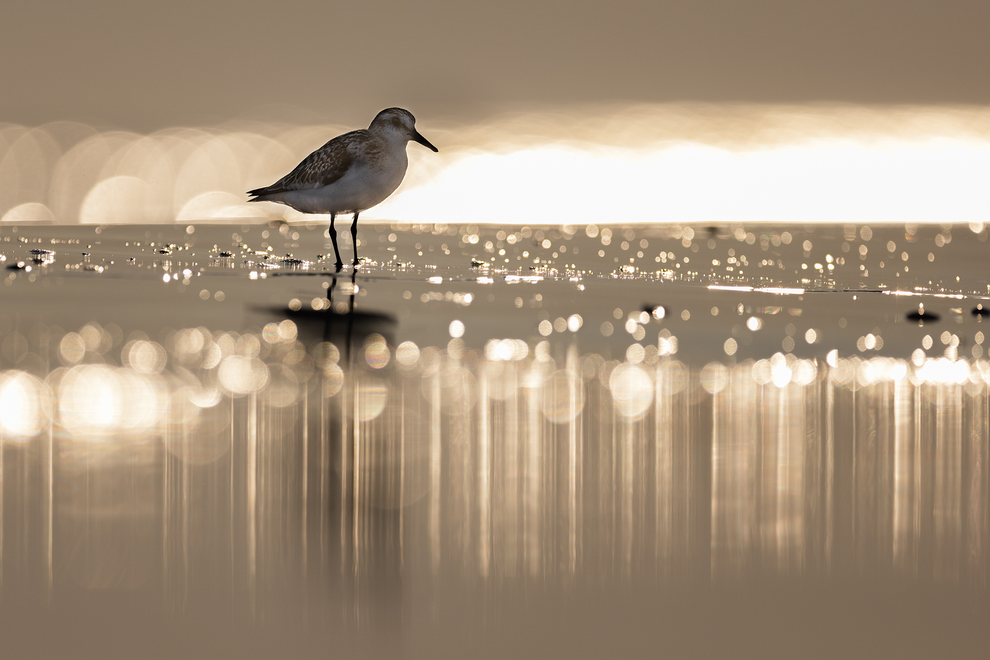 Die kleinen Stars der Watvögel sind für mich allerdings die Sanderlinge. Die Burschen sind meist in kleineren Trupps unterwegs und können absolut nicht still stehen. Immer gibt es was zu entdecken und so wuselt es ständig um einen herum. Mehrere Tage habe ich mich auf sie konzentriert und mich meistens so positioniert, dass sie früher oder später zwischen mir und der Sonne sind, so dass ich wieder die Möglichkeit habe, Fotos im Gegenlicht zu machen.