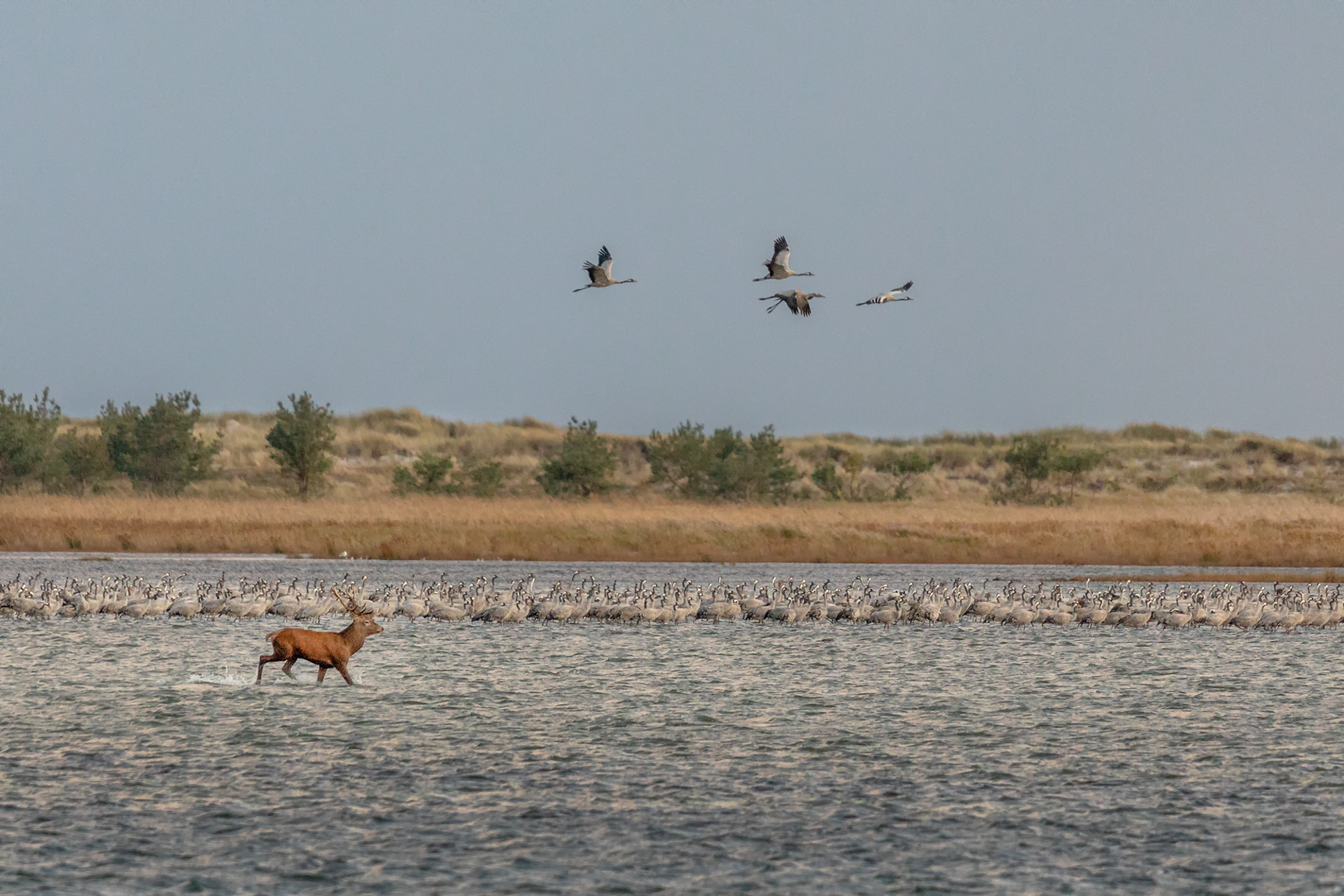 Ein ganz besonderes Highlight ist es jedoch das Erwachen der Kraniche am Pramort ganz im Osten der Halbinsel zu beobachten. Dort kommt man zum Sonnenaufgang nur mit einem Ranger oder mit einer Sondergenehmigung hin, eine genaue Vorbereitung ist also notwendig. Man wird jedoch mit einer unglaublichen Kulisse belohnt. Unzählige Kraniche stehen in dem seichten Wasser und starten nach und nach in den Himmel. Wenn dann noch ein Rothirsch durchs Bild läuft, ist der Morgen perfekt und das frühe Aufstehen wird mehr als belohnt.