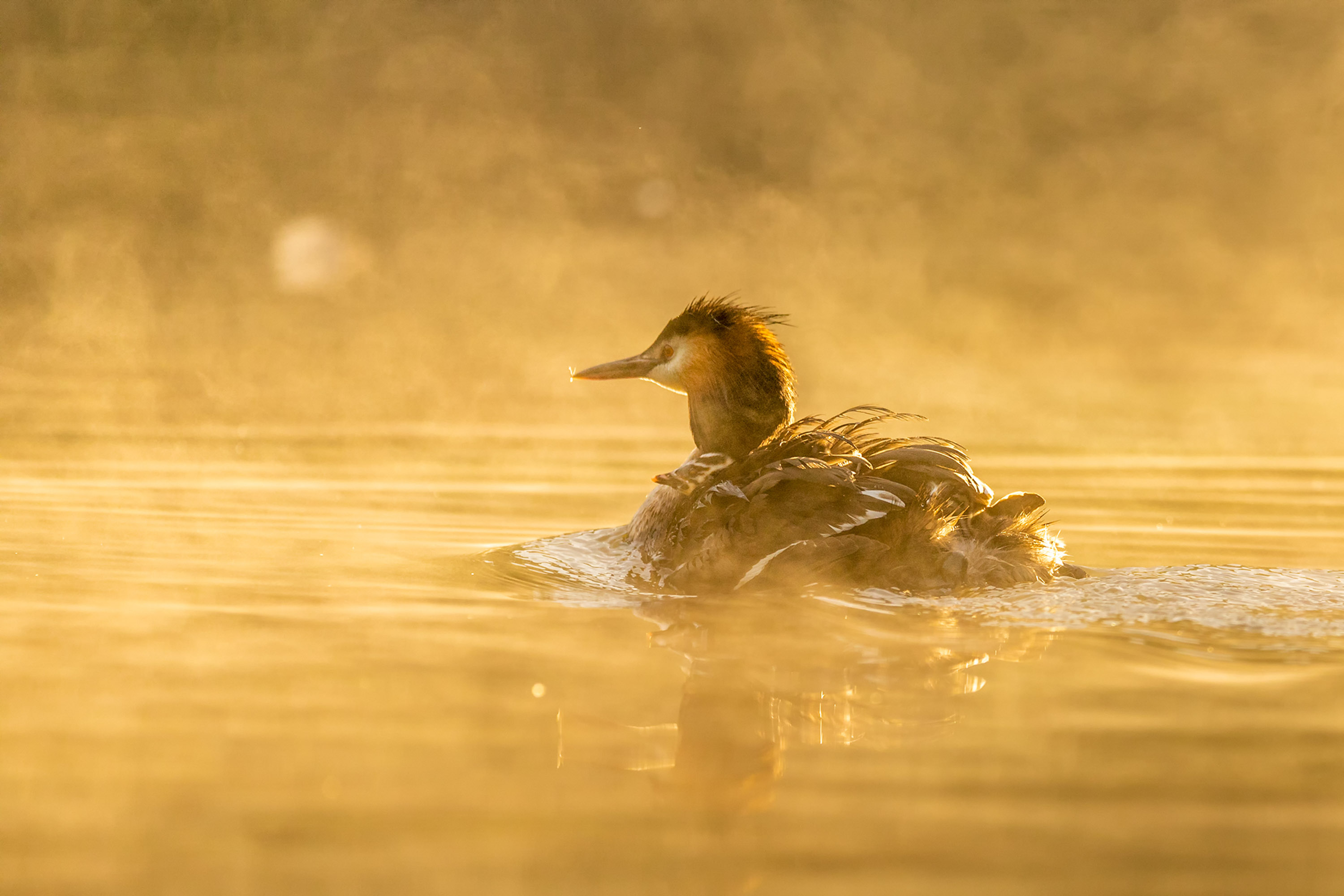 Letztendlich sind es drei kleine Minihaubentaucher geworden, die die nächsten drei Tage noch direkt im Nest gefüttert wurden. Doch schon bald wurde es Zeit, die Gegend zu erkunden. Bis zu dem Punkt war ich perspektivisch ausschließlich an das Nest gebunden. Da das Pärchen nun aber ständig unterwegs war, um kleine Fische zu suchen, konnte ich immer am Ufer entlanglaufen und hatte somit die Chance auf weitere verschiedene Lichtsituationen und vor allem auch auf Gegenlicht im Morgennebel.