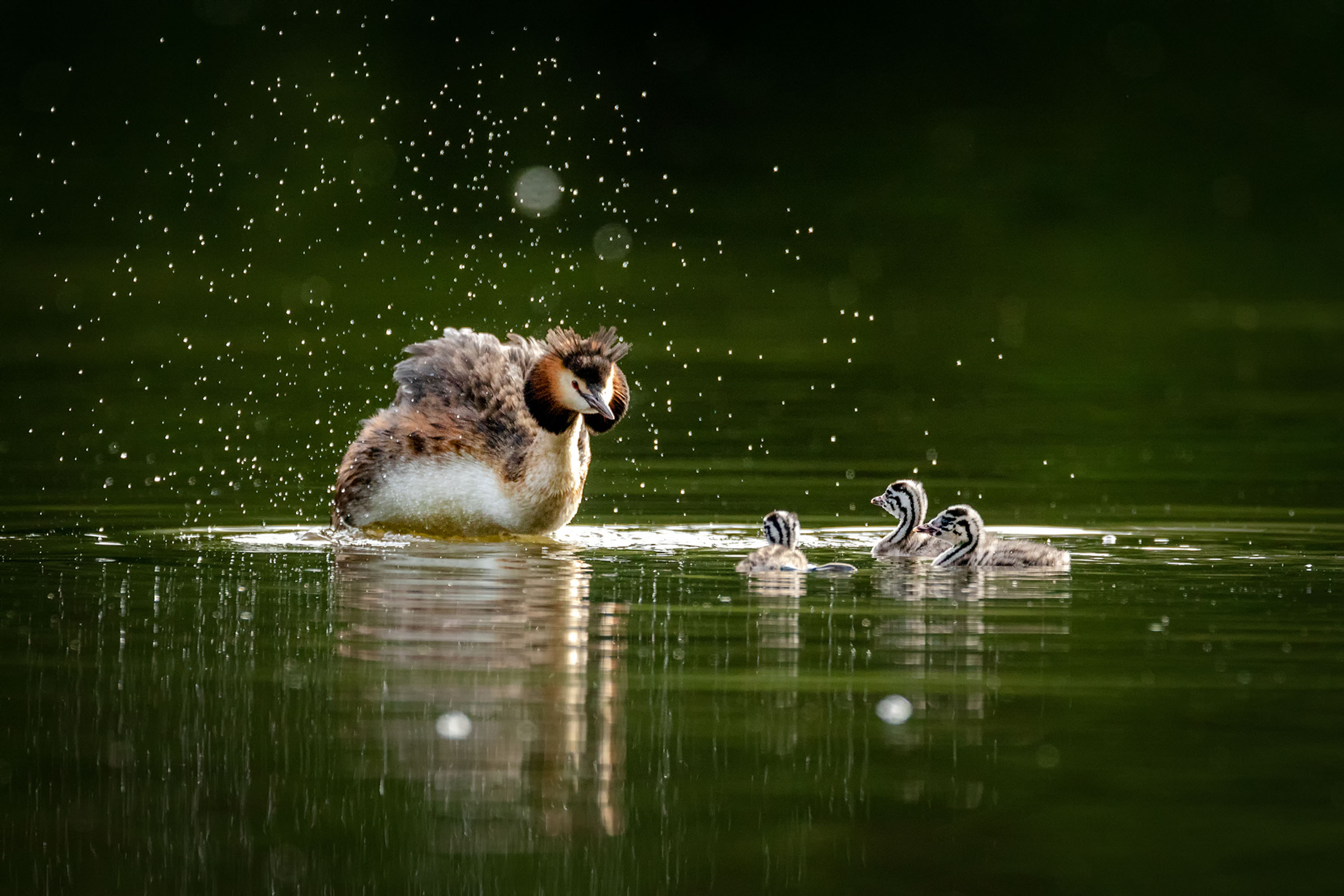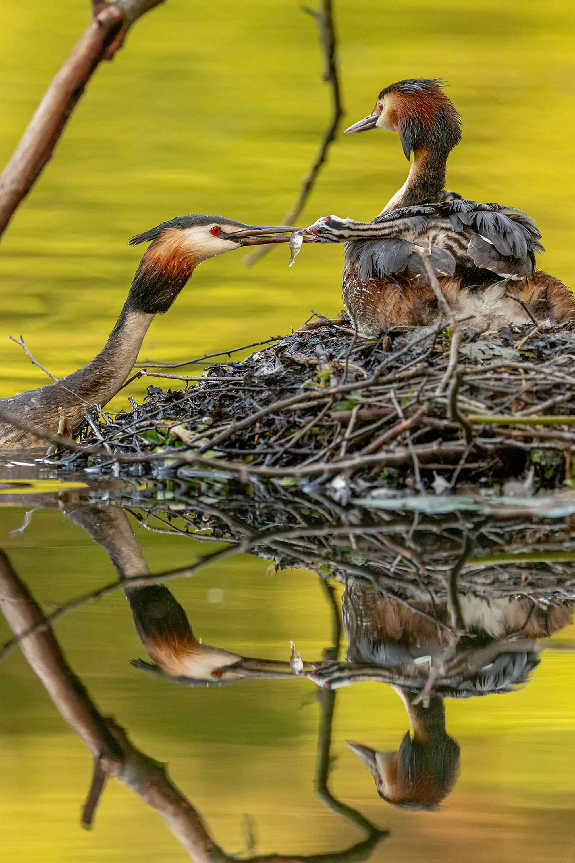 Anfang Juni bin ich wieder früh morgens zu den Haubentauchern und einer saß wie gewohnt auf dem Nest. Alles schien wie immer, doch als der andere ganz aufgeregt zum Nest schwamm und dabei auch noch einen kleinen Fisch im Schnabel hatte, wurde mir schnell klar was los ist. Am Nest angekommen, guckte plötzlich ein kleiner gestreifter Kopf aus dem Federkleid des sitzenden Haubentauchers und nahm den Fisch gierig in Empfang. Sie hatten es geschafft!