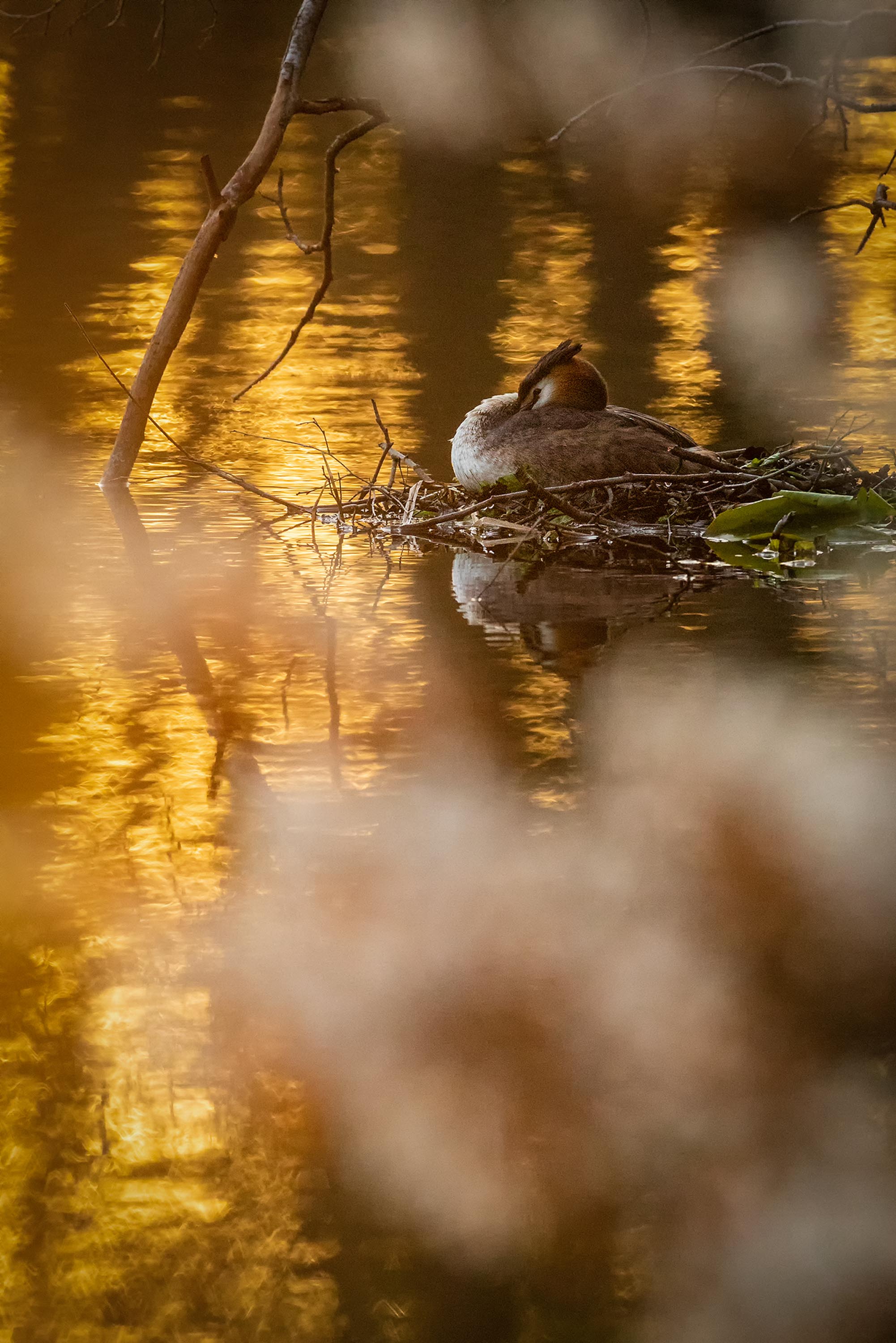 Glücklicherweise gibt es davon in Hamburg mehr als man in einer Großstadt zunächst erwarten würde. Der Frühling war überall zu spüren und wir entdeckten eine ganze Reihe von Vogelnestern. Doch so richtig spannend wurde es für mich in dem Moment, als wir ein Haubentauchernest entdeckten. Ich finde diese Vögel faszinierend und habe bereits vor ein paar Jahren ein Pärchen begleitet, in der Hoffnung die Küken fotografieren zu können. Damals ist leider nichts daraus geworden. So viel schon vorab, dieses Mal wird es nicht ganz so dramatisch.