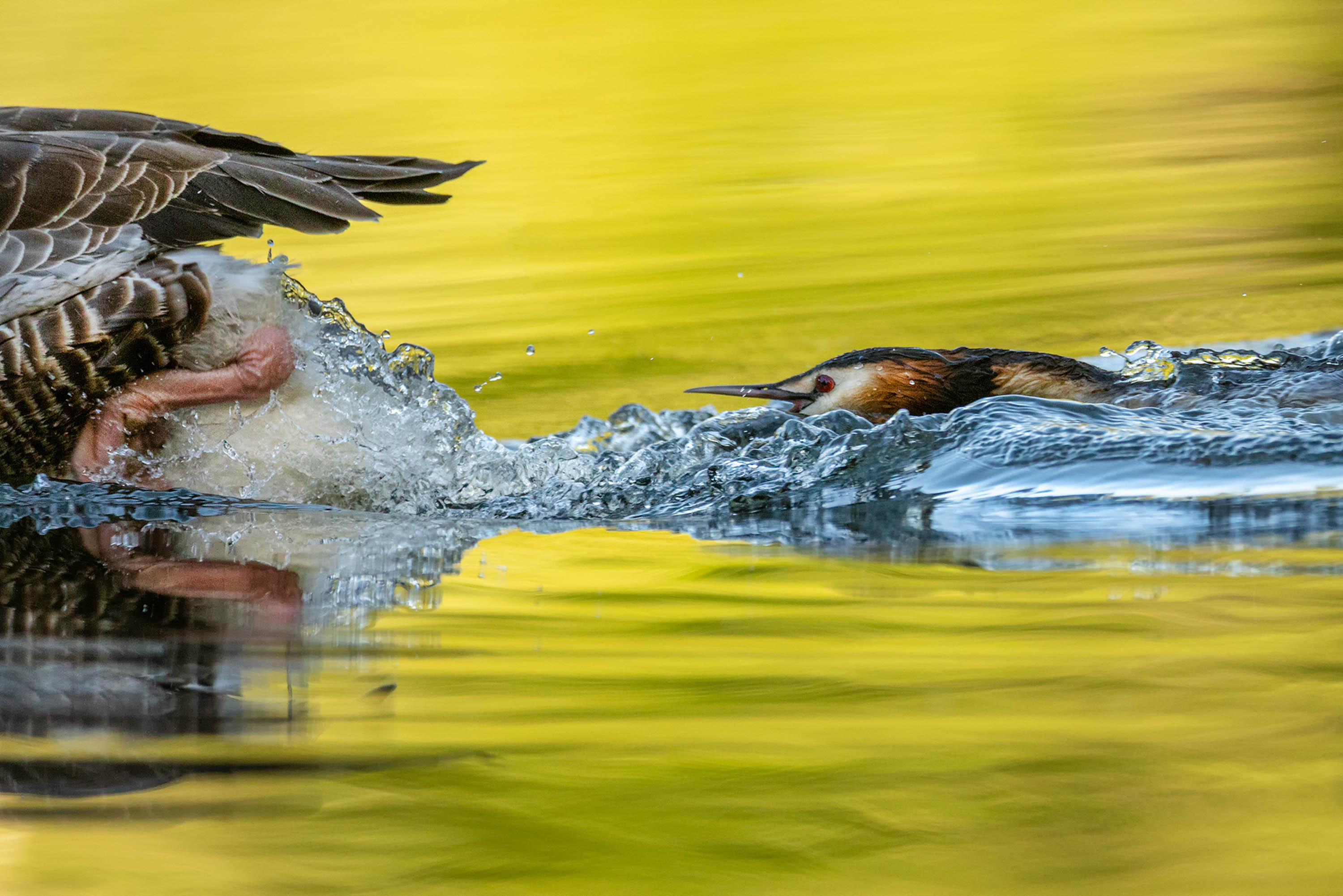 Die Zeit war nun bald rum und die Küken mussten jeden Tag schlüpfen. Die Haubentaucher gingen auf Nummer sicher und ließen niemanden zu nah an das Nest heran. Selbst die sonst so streitlustigen Graugänse wurden vehement verscheucht. Mit diesem spitzen Schnabel wollte sich Keiner anlegen!