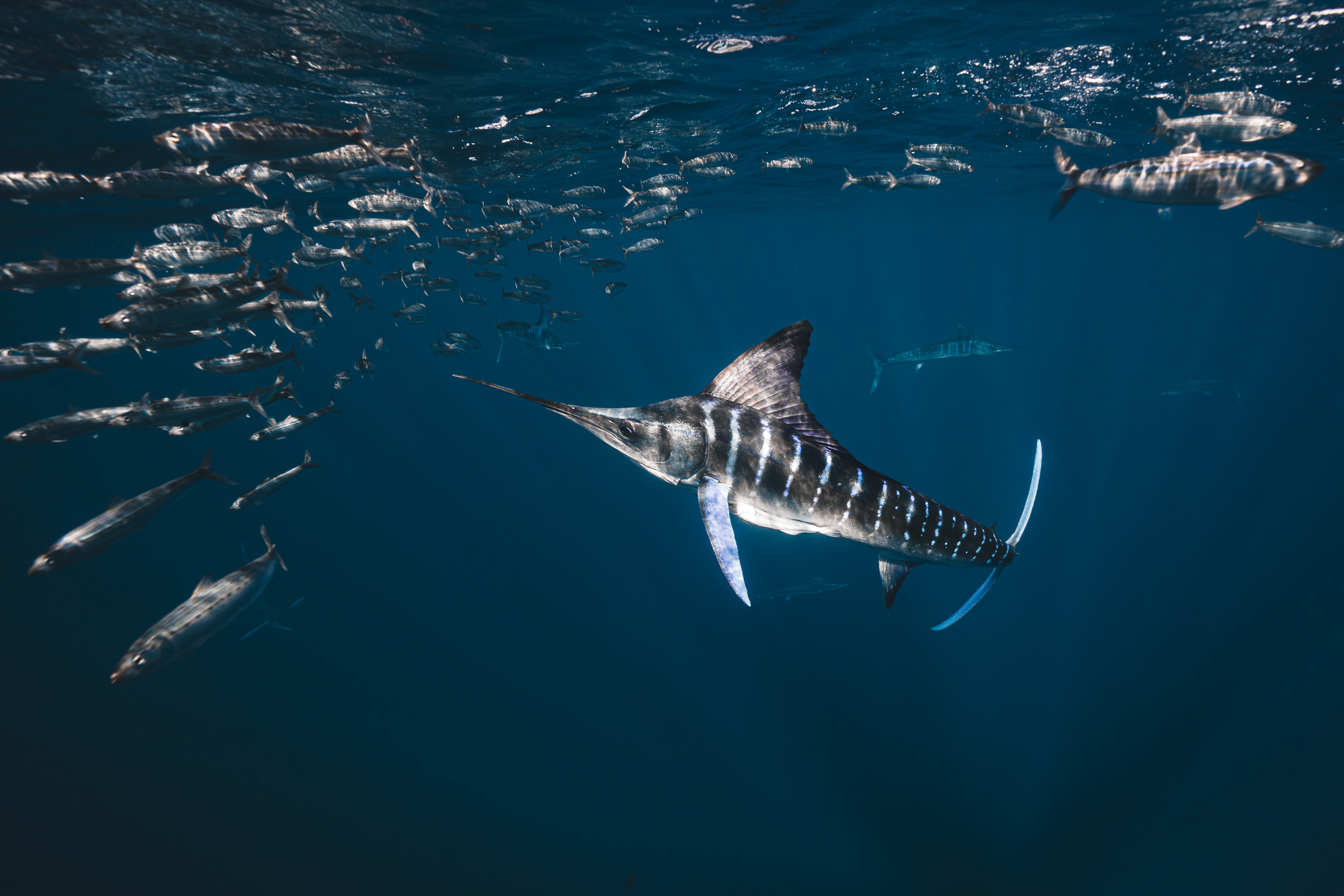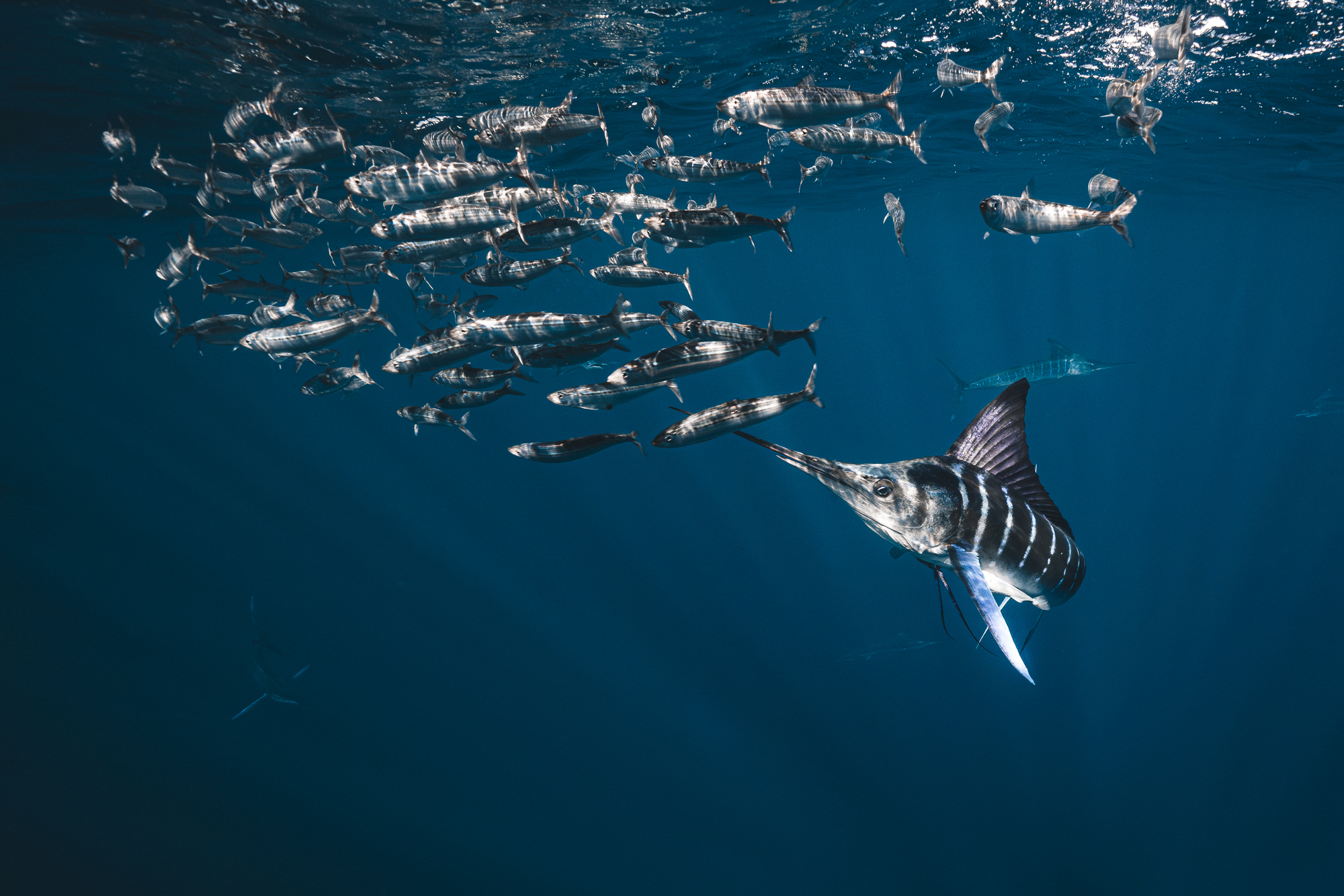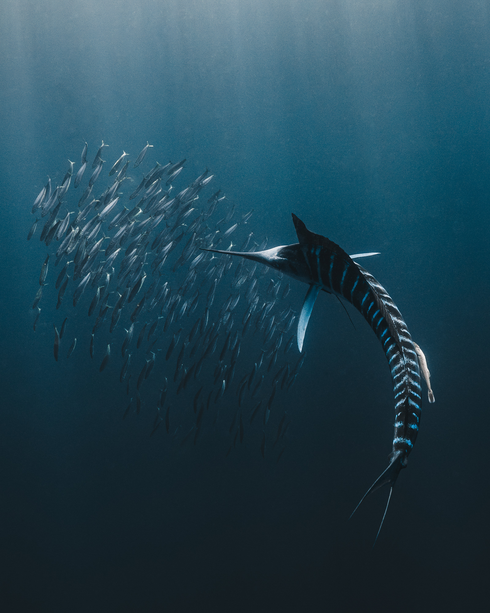 Dennoch sollte man sich als Fotografin nicht dazu verleiten lassen, die Kamera immer auf die Prädatoren gerichtet zu haben. Auch wenn diese sich manchmal von dem Schwarm entfernen: Immer beim Bait Ball bleiben. Denn dieser ist die Beute, zu der alle wollen. Gleichzeitig deutet ein längerer Rückzug der Marlins darauf hin, dass man als Mensch zu nah am Schwarm ist. Die Tiere sehen in uns Menschen dann andere Prädatoren, vor denen sie Respekt haben und sie ziehen sich zurück.