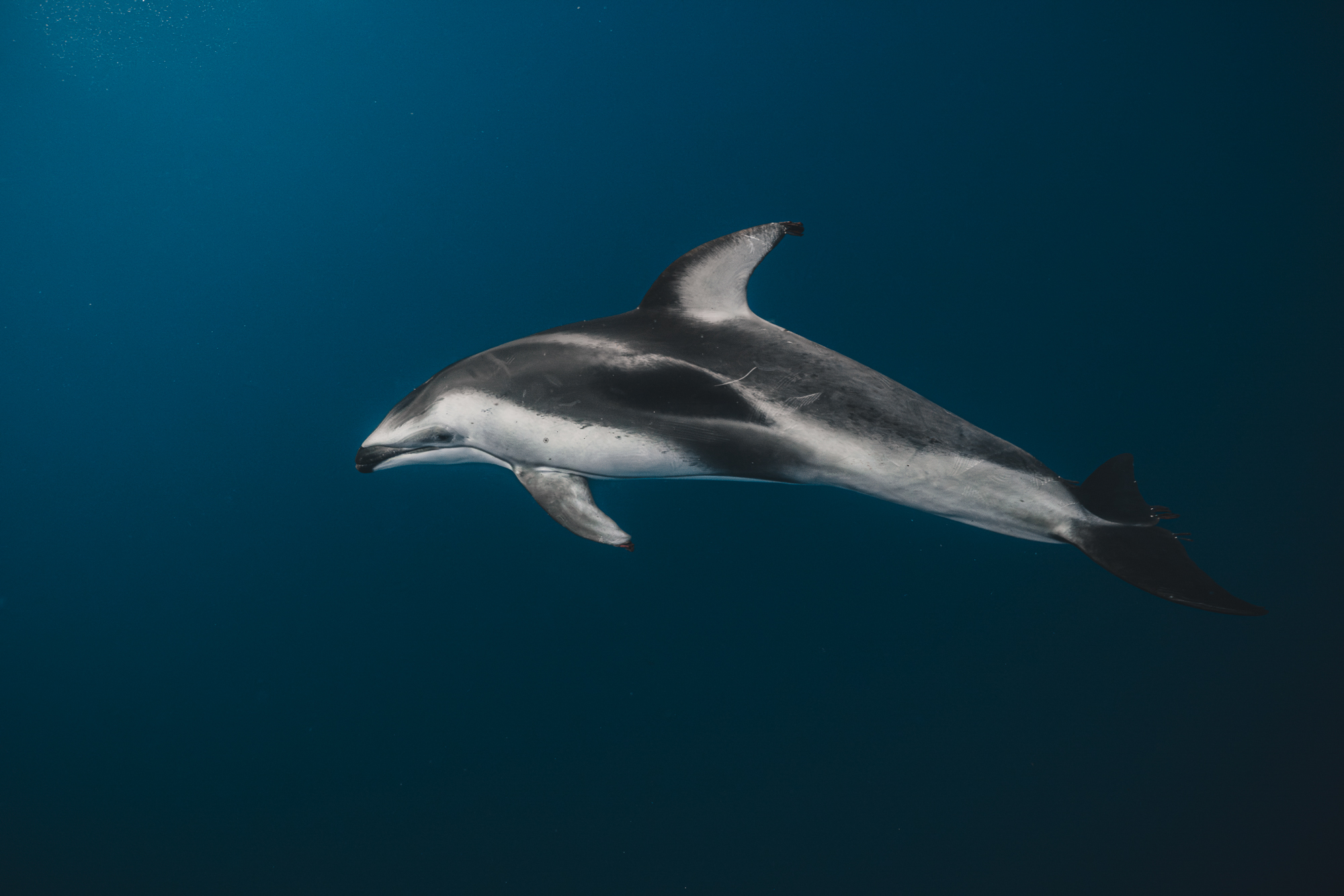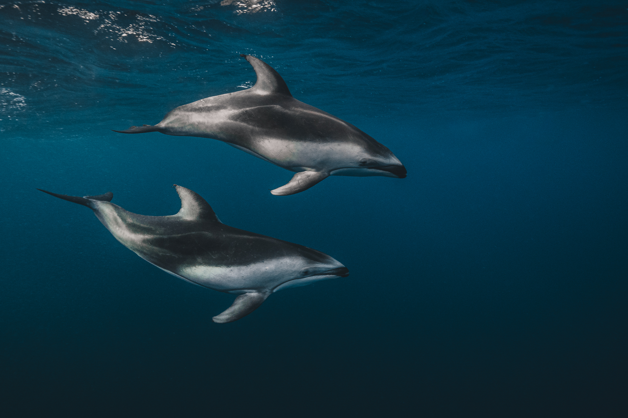 Für uns ist der Sardine Run vor Magdalena Bay eins der eindrucksvollsten Naturschauspiele des Meeres. Oft fühlten wir uns wie mitten in einer National Geographic Dokumentation. So konnten wir unser Glück kaum fassen, als wir die Chance hatten mit Pazifischen Weiß-Seiten Delfinen zu schwimmen. Während andere Delfin-Arten meist eher wenig Interesse an uns Menschen zeigen, ist diese Art dafür bekannt, besonders verspielt und neugierig zu sein. Als wir nun also inmitten eines riesigen Pods schwammen und tauchten, kamen die Tiere immer wieder zu uns.