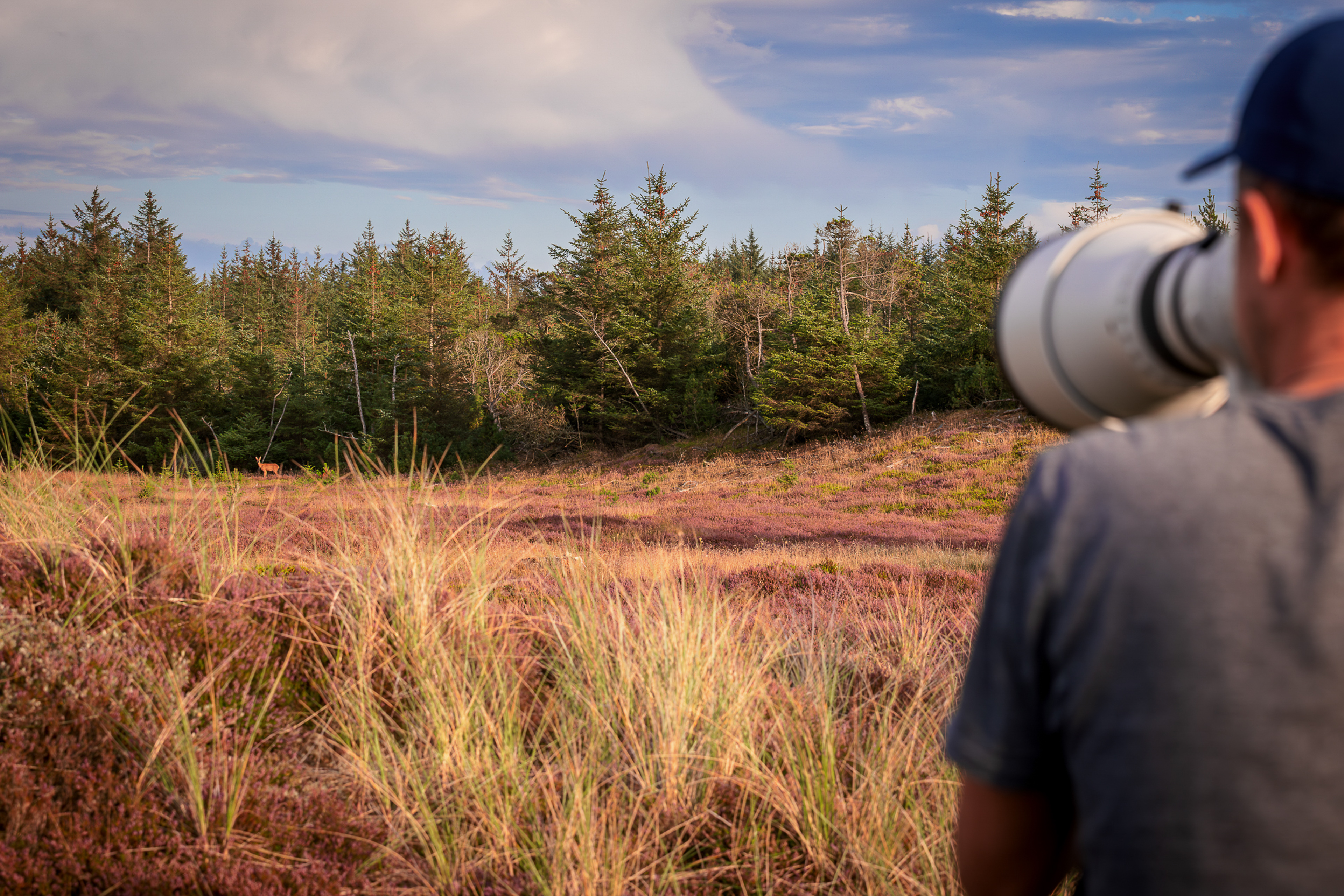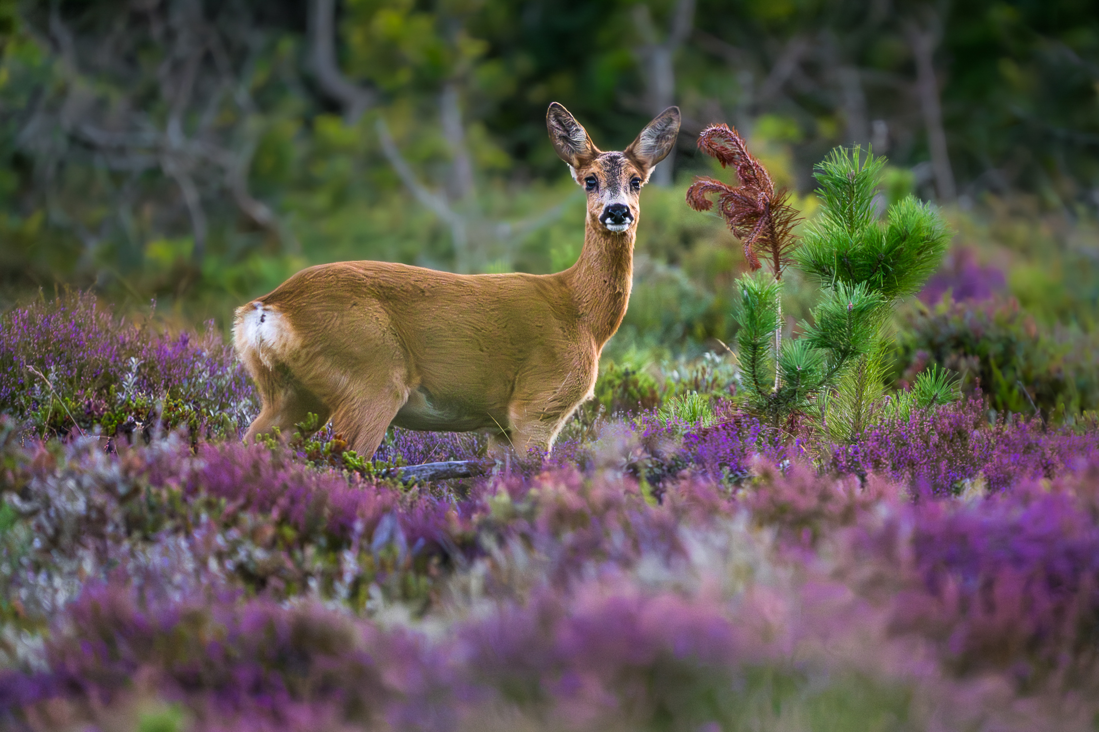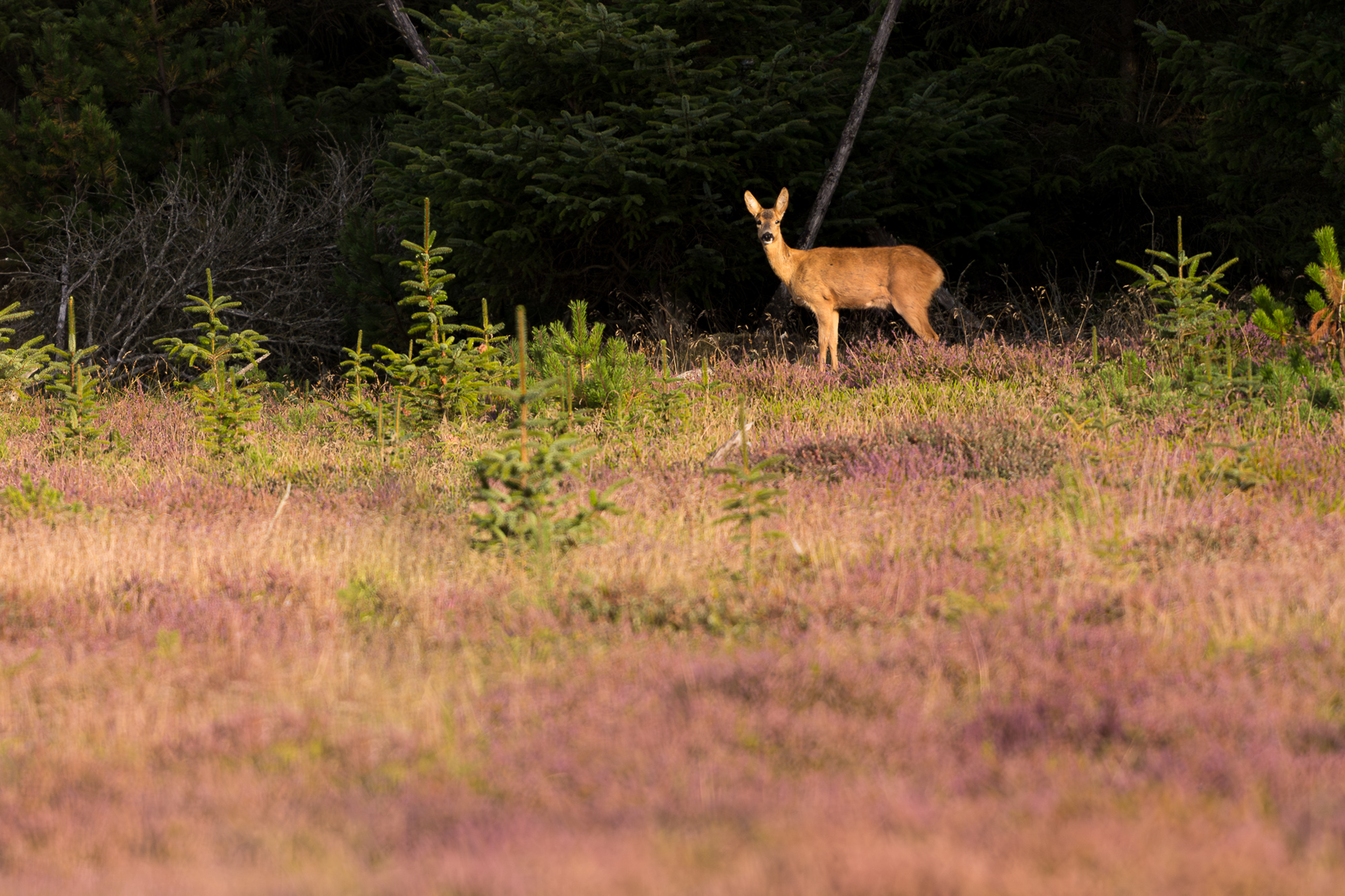 Wenn das Setting, wie die blühende Heide und dann auch noch das Licht passt, muss man nur noch auf das richtige Motiv warten, wie ein Reh im violetten Blütenmeer.