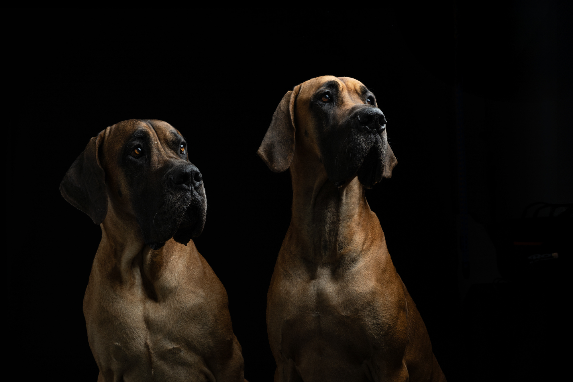 Wenn du professionelle Studiobilder zu Hause fotografieren möchtest, empfehle ich den Einsatz von zwei Studioblitzen mit Schirm. Wenn du etwas mehr investieren möchtest, sind zusätzlich zwei Softboxen eine gute Wahl. Besonders Octaboxen eignen sich hervorragend, da sie in den Augen der Hunde runde Lichtreflexe erzeugen, die ich persönlich schöner finde als rechteckige.