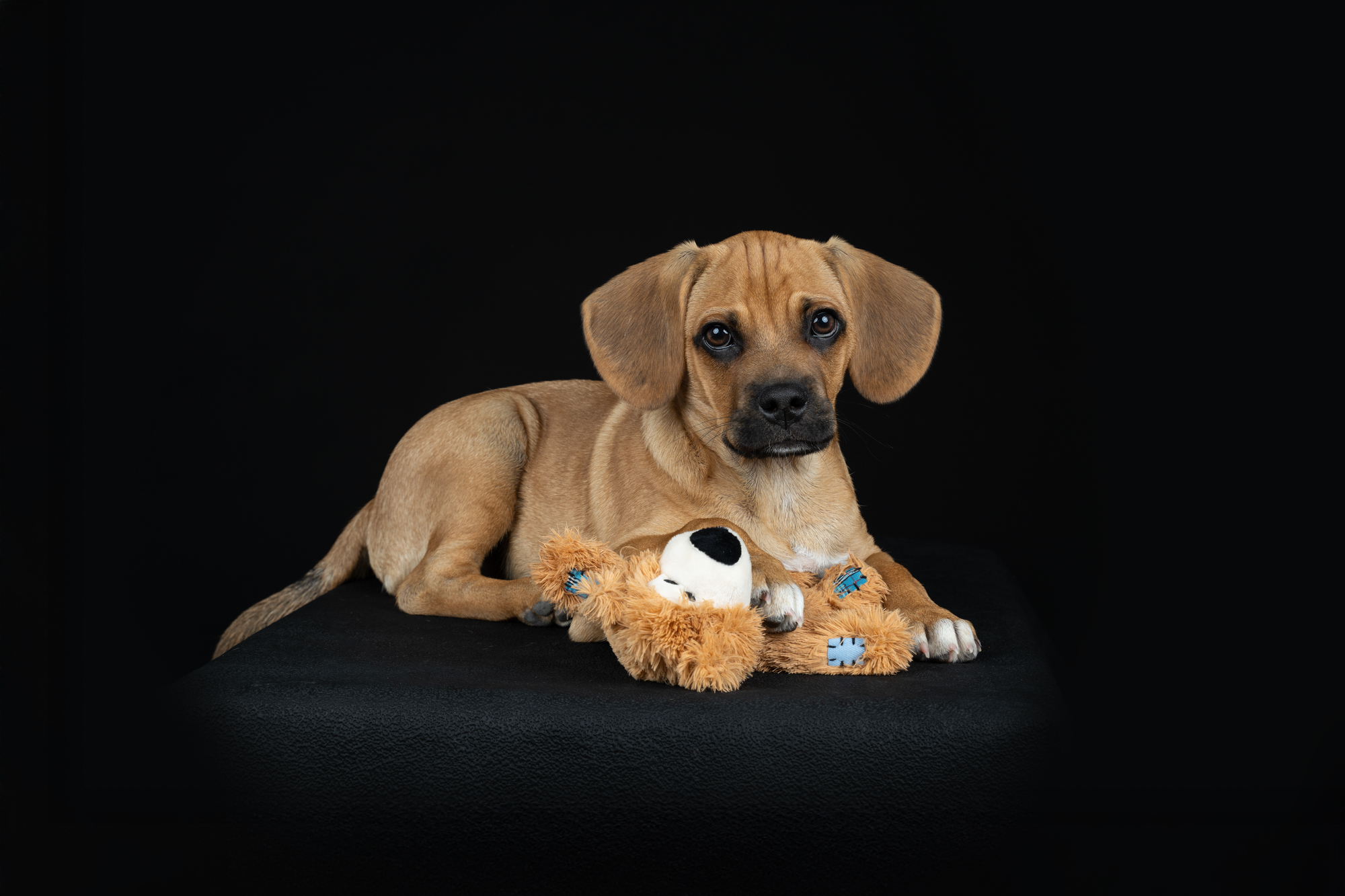 Für eine vorteilhafte Perspektive eignet sich bei kleinen Hunden eine stabile Holzkiste mit einer rutschfesten Matte hervorragend. Die Kiste, die ich benutze, ist 42 cm hoch, was es dir ermöglicht, je nach Größe des Hundes im Sitzen oder im Knien zu fotografieren. Mit der richtigen Ausrüstung und ein wenig Kreativität kannst du beeindruckende Studiofotos von Hunden auch ganz einfach, bei dir zuhause, fotografieren.