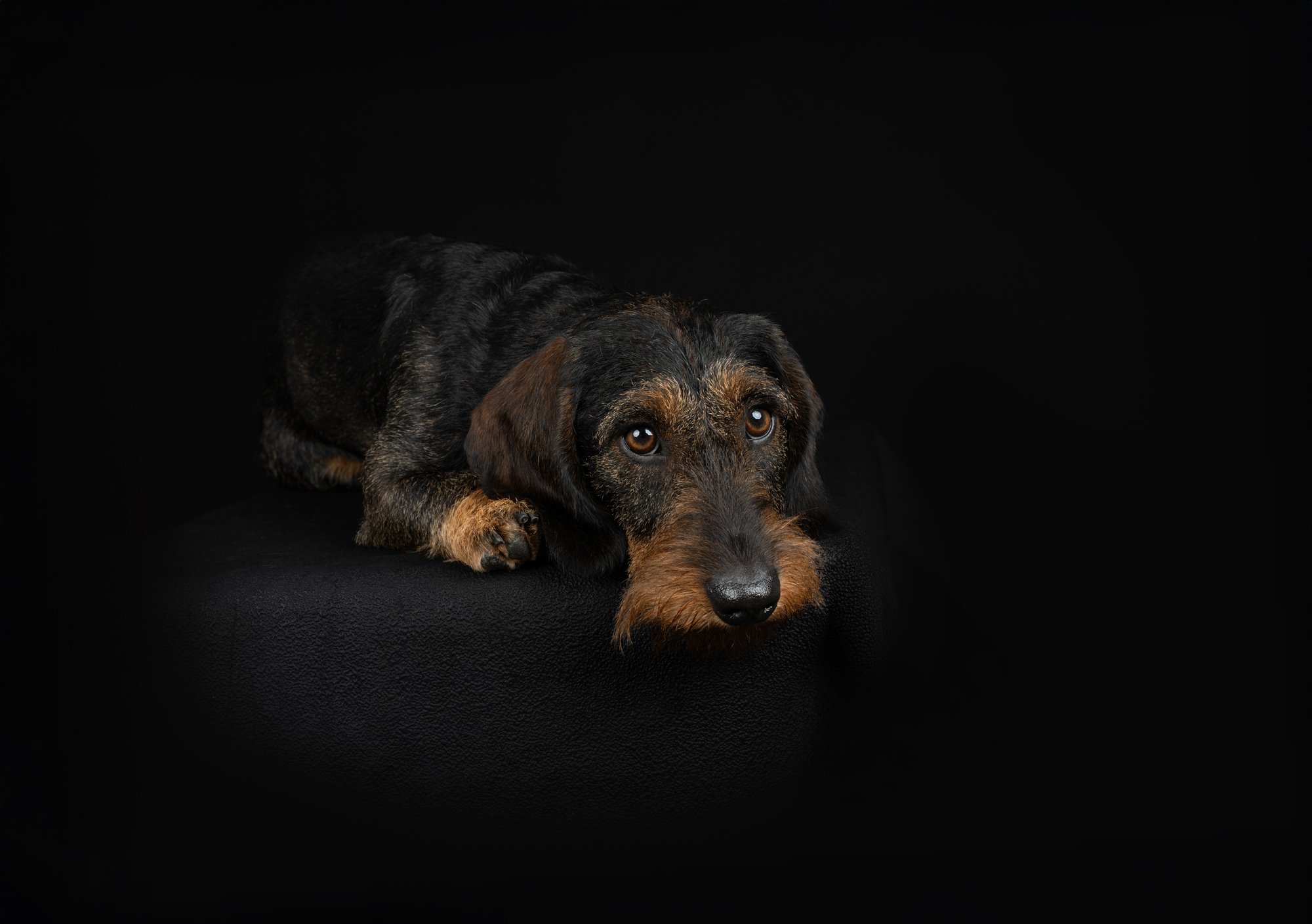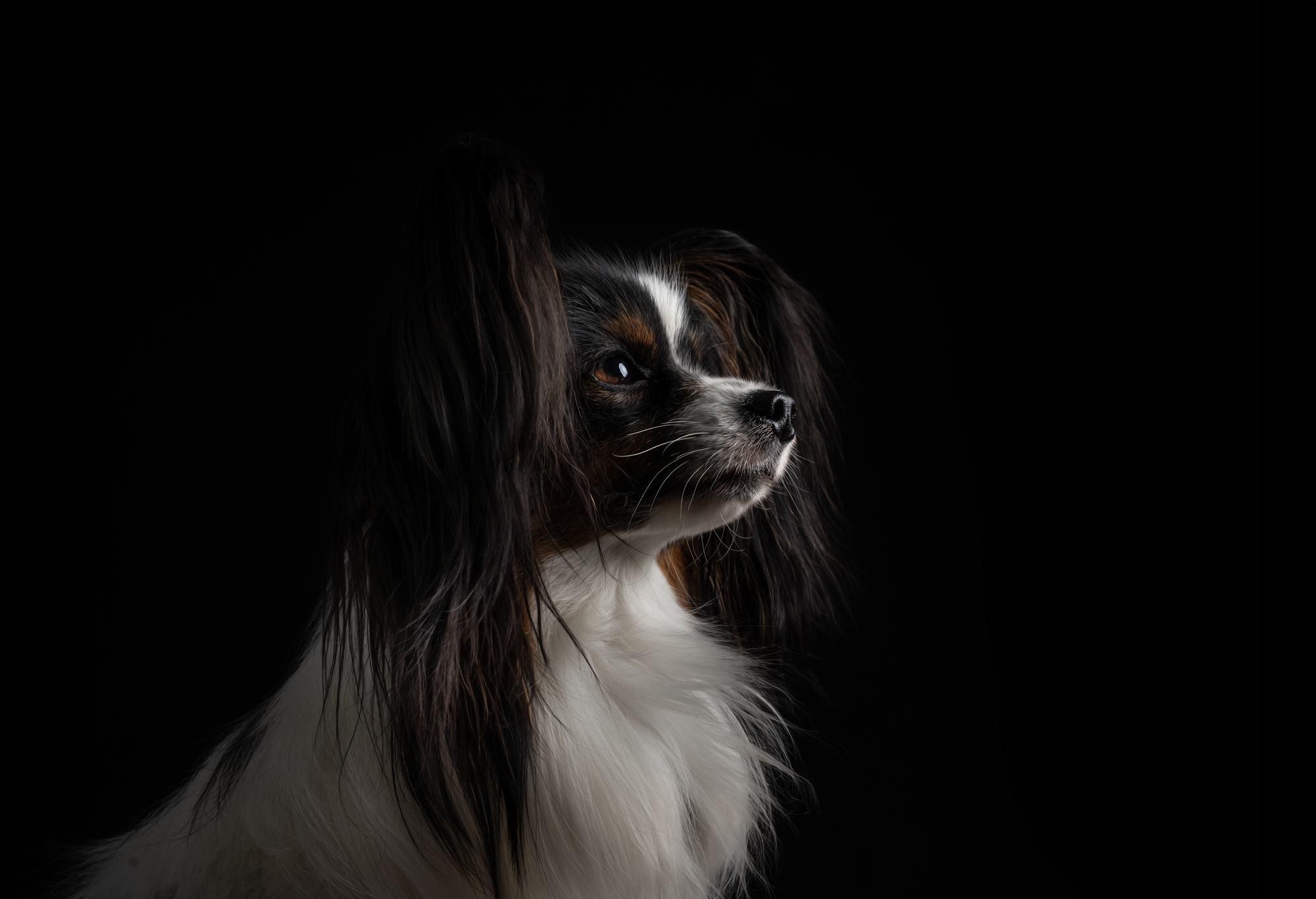 Es ist jedoch wichtig, dass der Hund nicht zu nah am Hintergrund positioniert wird. Je näher der Hund an dem dunklen Hintergrund sitzt, desto mehr Licht fällt auf diesen und das erschwert es, ein tiefschwarzes Ergebnis zu erzielen. Zwei bis drei Meter Abstand sind optimal. Bei hellen Hunden gestaltet sich die Belichtung wesentlich einfacher als bei einem schwarzen Hund.