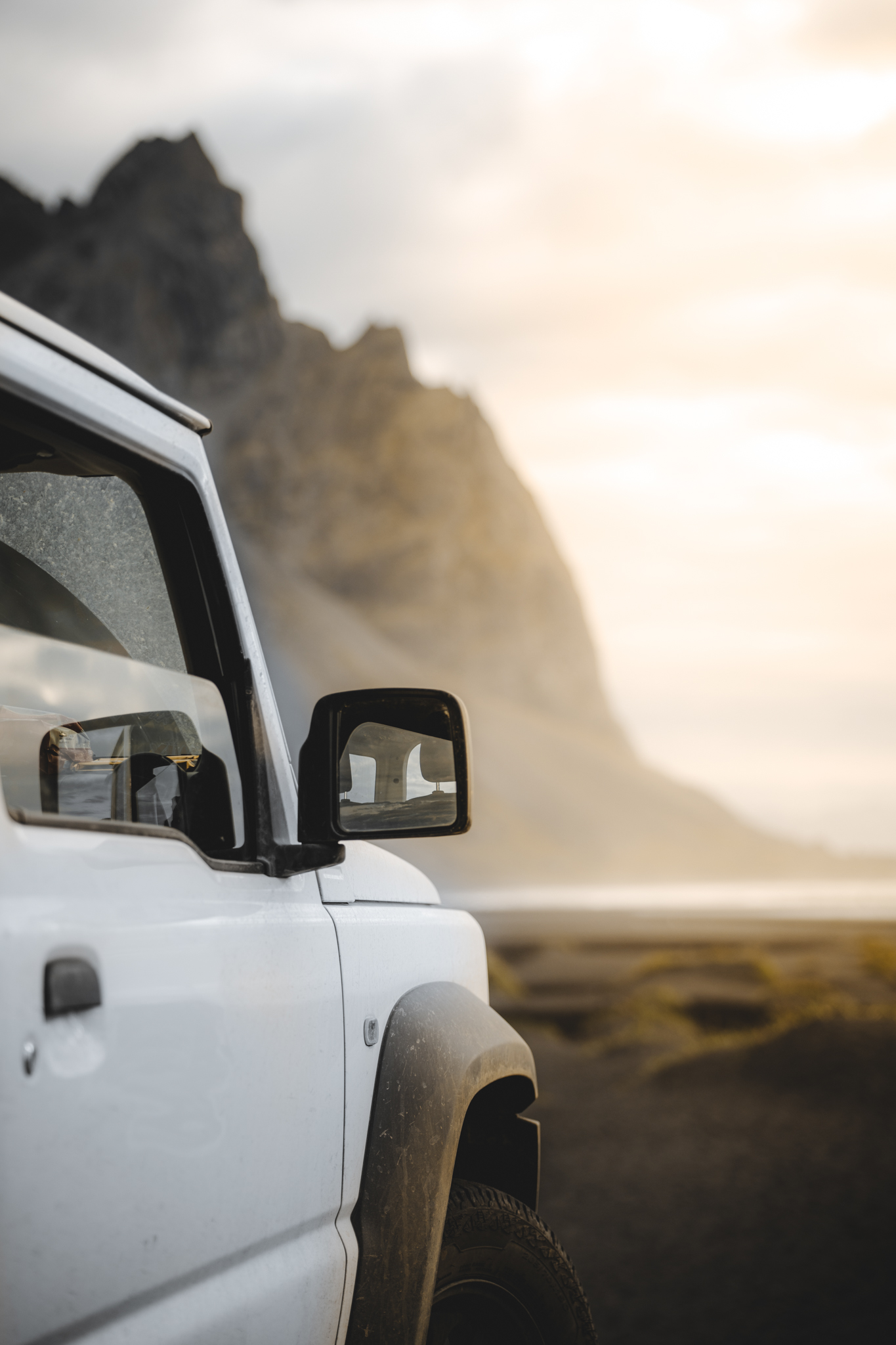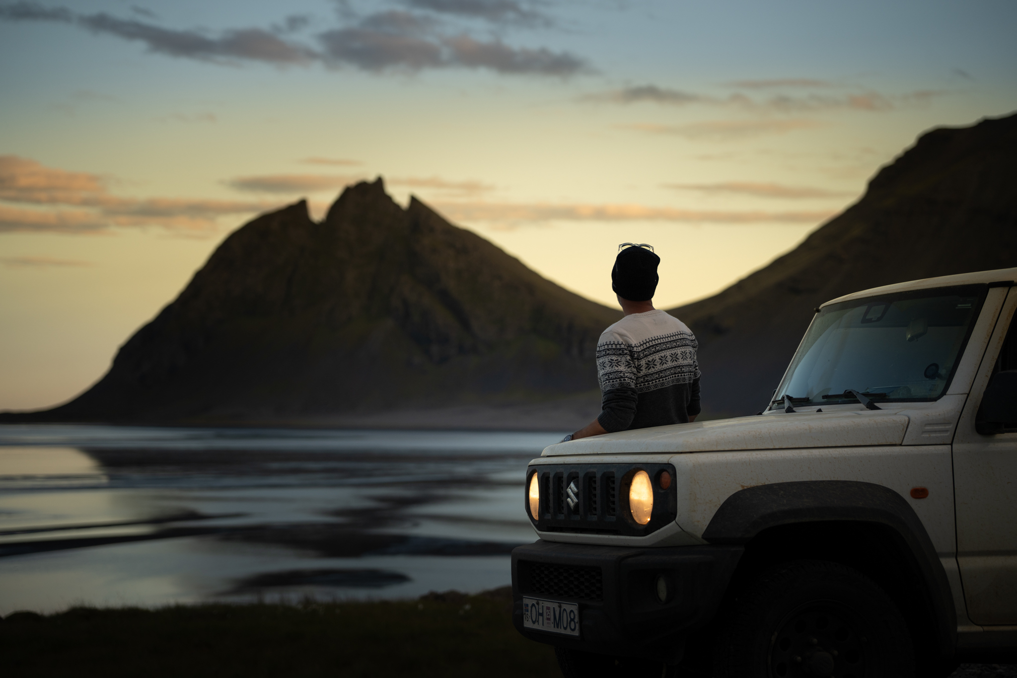 Nach dem frühmorgendlichen Shooting kam die Sonne raus und an gute Fotos war zu diesem Zeitpunkt nicht zu denken. Daher beschlossen wir kurzerhand, unsere letzte Unterkunft aufzusuchen und unser Schlafpensum etwas nach oben zu schrauben. Nach ein paar Stunden der Ruhe trieb es uns allerdings schon wieder raus. Wir wollten zumindest noch ein paar schöne Sonnenuntergangsfotos machen, die uns in Stokksnes nicht so ganz geglückt waren. Also fuhren wir mit unserem Jimny nochmal los. Die Sonne stand schon knapp über dem Horizont und wir konnten unseren letzten Tag auf Island mit vielen tollen Fotos ausklingen lassen.