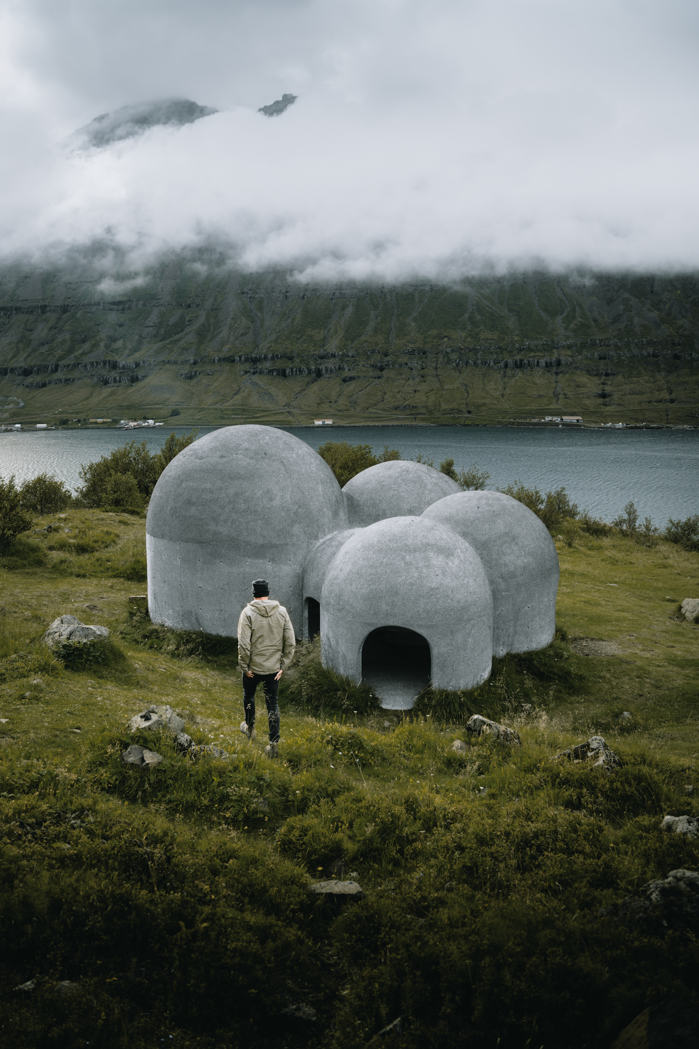 Nachdem wir gegen Nachmittag in Seyðisfjörður angekommen waren, ging es für uns nicht direkt zu der bekannten kleinen Kirche im Ort, mit der farbig bemalten Straße davor, sondern ein Stück weiter zu einer kleinen Fischfabrik. Von hier aus startet nämlich ein kleiner Trail hinauf zu einer Kunstinstallation eines deutschen Künstlers. Dieser hat auf einem Plateau vier verbundene Klangkuppeln aus Beton kreiert, in denen wohl unterschiedliche Töne entstehen. Doch auch fotografisch hat dieses Kunstprojekt einiges zu bieten, denn die Landschaft, in die die Kuppeln eingebunden sind, ist einfach typisch Isländisch und wunderschön. Und so bietet das Motiv einen schönen Kontrast zwischen Beton und Natur.