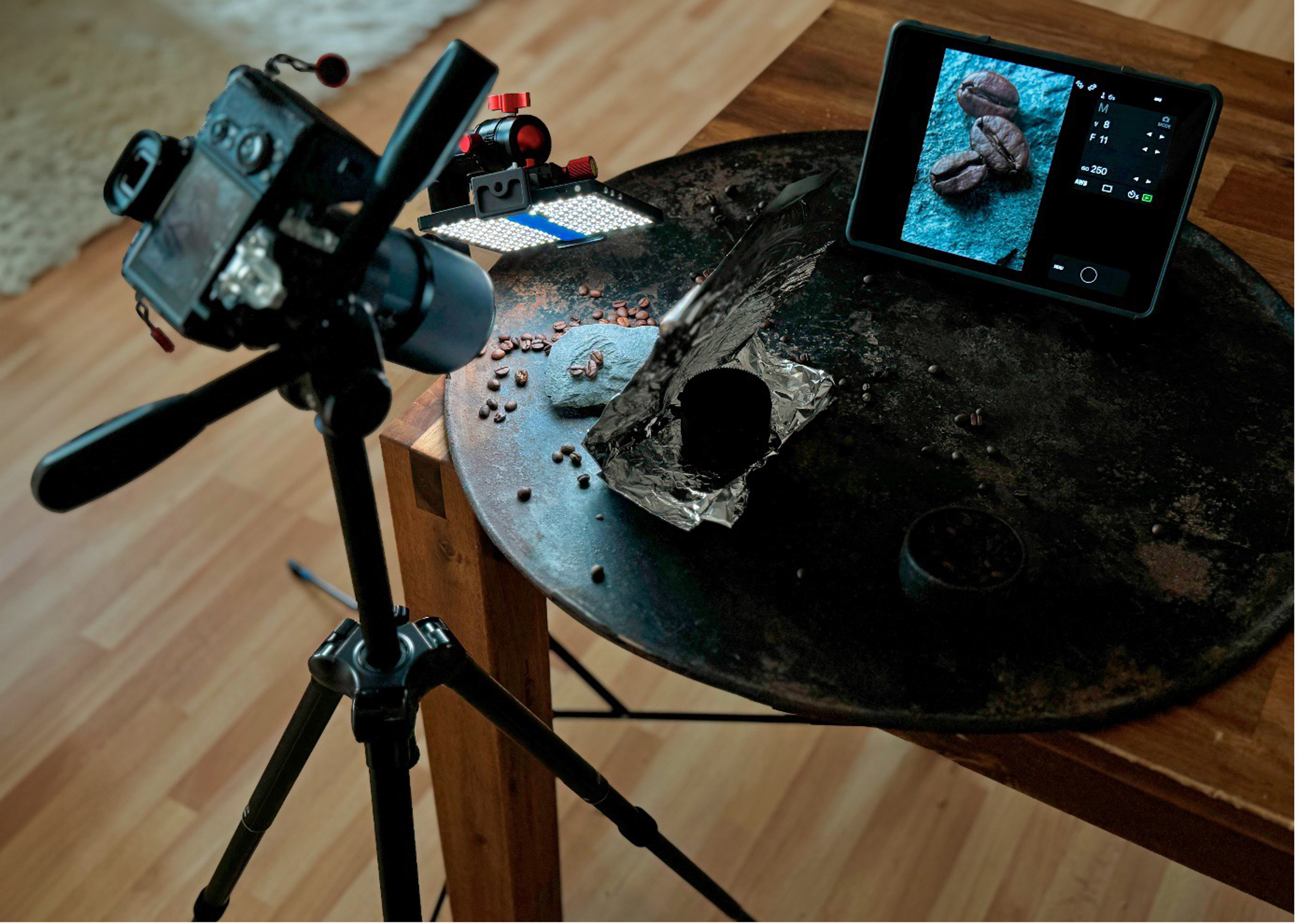 Der Aufnahmeplatz zeigt das Stativ, die Kamera mit dem 105er-Makroobjektiv, die Zweier-LED-Leuchte, das Kaffeebohnenmotiv, den Reflektor aus Aluminiumfolie gegenüber und das iPad zur sofortigen Kontrolle der Ergebnisse.