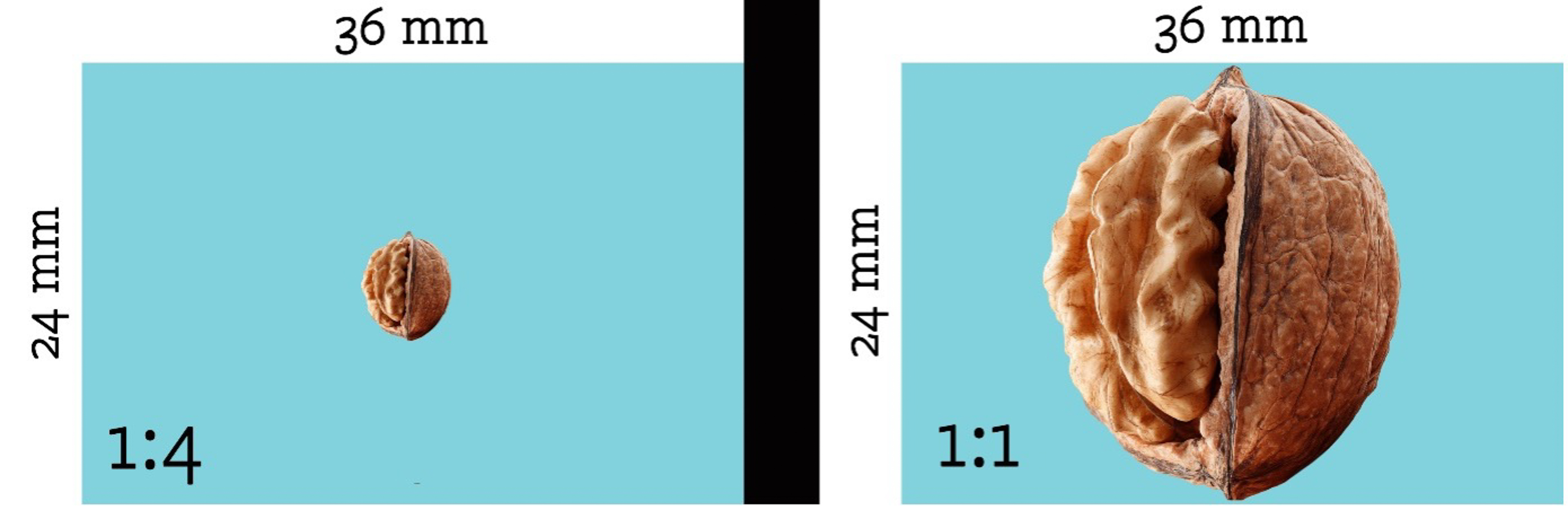 Bisher haben wir für viele Fotos ein klassisches 24-70-Zoom am Vollformat verwendet. Einmal war das das Canon EF 24-70mm f/2.8L II, einmal das Sigma 24–70mm F2.8 DG DN II | Art. Beide Objektive haben eine Naheinstellgrenze von rund 40 cm, verbunden mit einem Abbildungsmaßstab von 1:4. Den Abbildungsmaßstab nennt man auch die „Vergrößerung“. Er besagt, wie groß ein Motiv auf dem Sensor abgebildet wird. Eine Walnuss mit einem Durchmesser von 24 mm wird bei Vergrößerung 1:4 auf einem Vollformatsensor 6 mm hoch abgebildet. Bei einer Vergrößerung von 1:1 füllt die Nuss den Sensor in der Höhe.