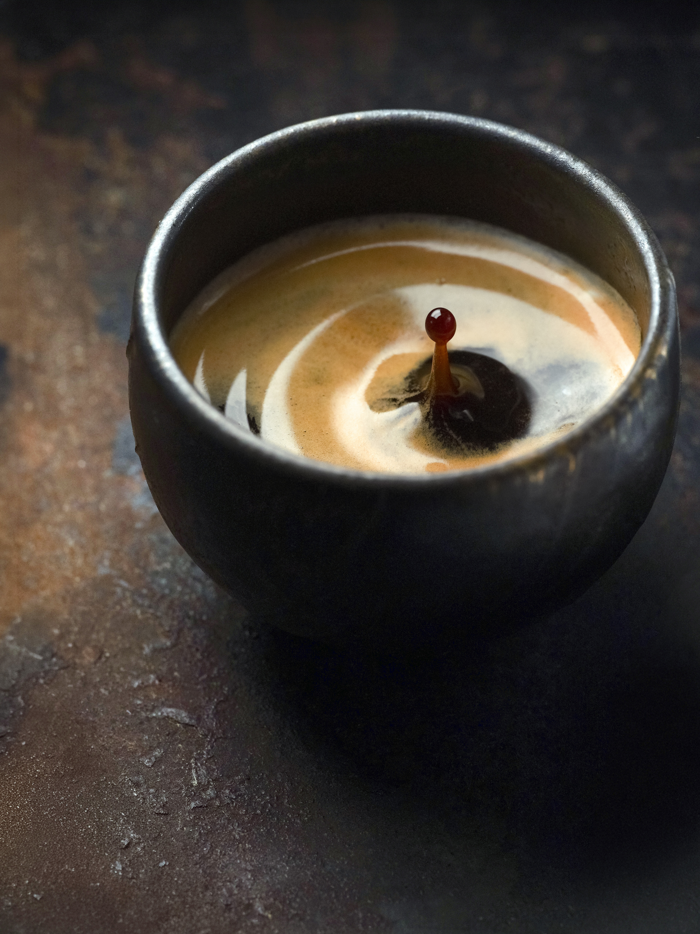 Blende 6,3, Belichtungszeit 1/640 Sekunde, ISO 800, Handauslösung, Serienbildaufnahme, JPEG-Format. Die zwei Lampen stehen nun auf maximaler Lichtstärke. Ein Blatt Butterbrotpapier ist als Diffusor vor den Lampen angebracht, weil der Kaffee sonst in der Reflexion die einzelnen LEDs zeigen würde. Die Kamera ist manuell vorfokussiert auf jene Stelle, wo die Tropfen zu erwarten sind.
