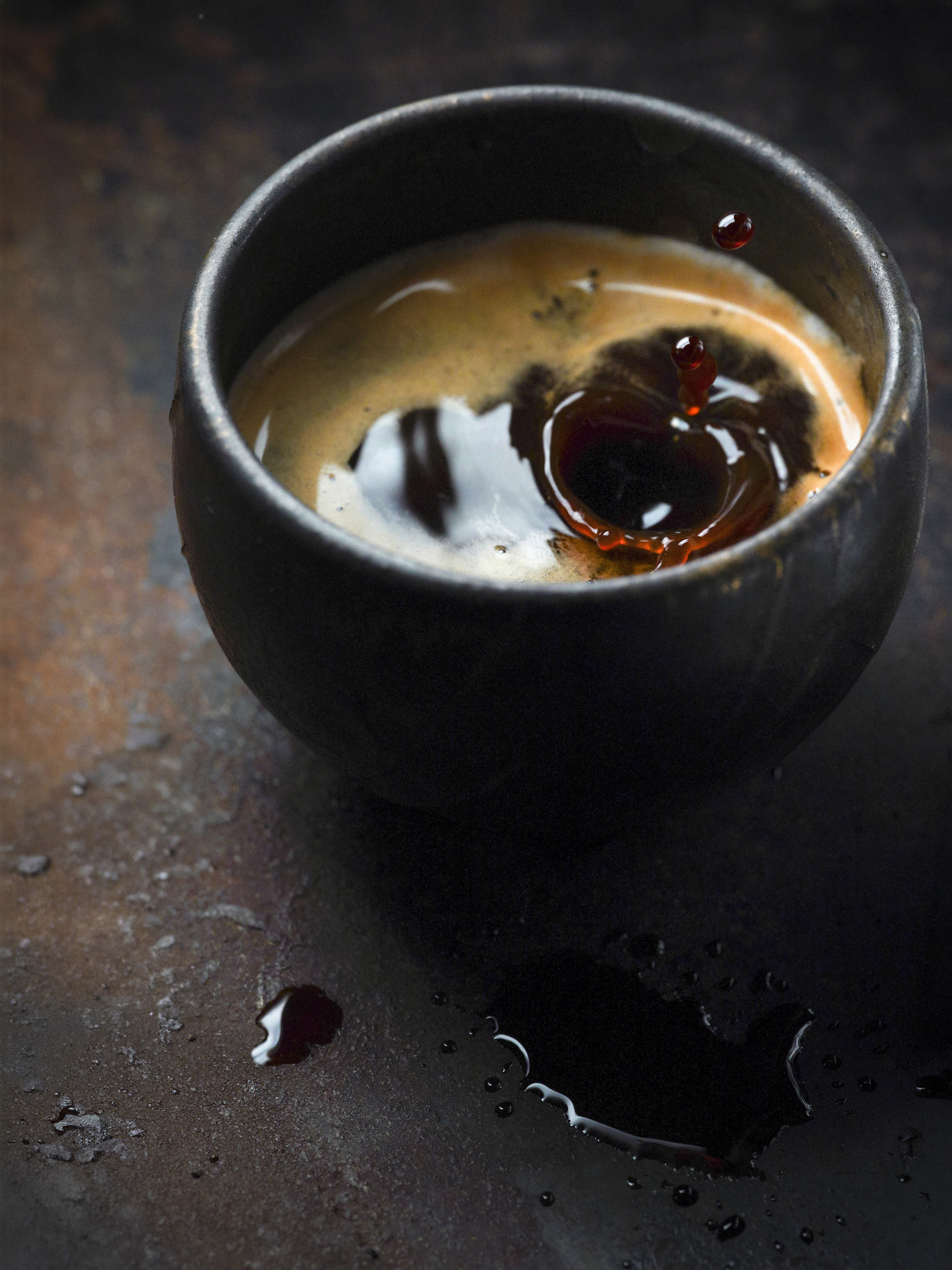 Im Moodboard seht Ihr auch ein Bild mit einem Tropfen, der in Kaffee fällt – einen Coffee Splash. Für solche Fotos setzt man normalerweise einen Blitz ein, um die Bewegung einzufrieren und lässt dann die Tropfen durch eine Lichtschranke wie die Jokie von Eltima fallen. Damit wird fast jeder Schuss ein Treffer. Ich besitze auch eine Jokie, habe aber keine Zeit und Ruhe, sie anzuschließen. Der Aufbau aus Sync-Kabel, Blitz, Lichtschranke und dem zugehörigen Reflektor ist doch schon etwas aufwändiger. Es geht aber auch ohne Blitz und Lichtschranke. Wichtig ist nur die kurze Belichtungszeit. Annähernd scharf werden die Tropfen ab 1/500 Sekunde, doch die Kamera steht im Moment auf 1/8 Sekunde.