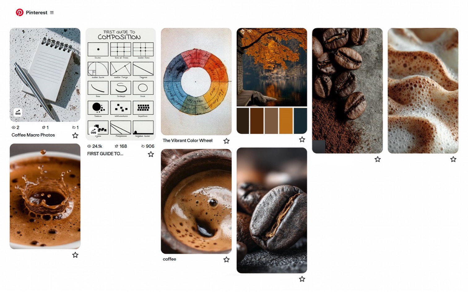 Mir schweben Fotos vor, die die gerösteten Bohnen, das Pulver und die Crema ganz nah zeigen. Für ein paar konkrete Ideen zu Farbe und Form starte ich Pinterest und gebe ein coffee macro. Dann stelle ich mir ein Moodboard zusammen, das die Kompositionsregeln, den Farbkreis und eine Farbpalette enthält. Und dann füge ich dort passende Makrofotos ein –Makros von den Bohnen, vom Milchschaum, von der Crema und von Tropfen, die in Kaffee fallen. Die Farbwelt ist fast durchgängig warmund in analogen Tönengehalten. Aber es kommt auch ein Warm-Kalt-Kontrast infrage. Als mögliche Form merke ich mir eine eher asymmetrische Anordnung mit etwas Freiraum rechts oder links.