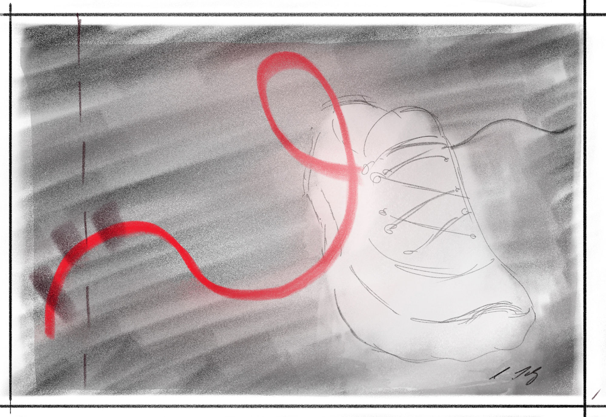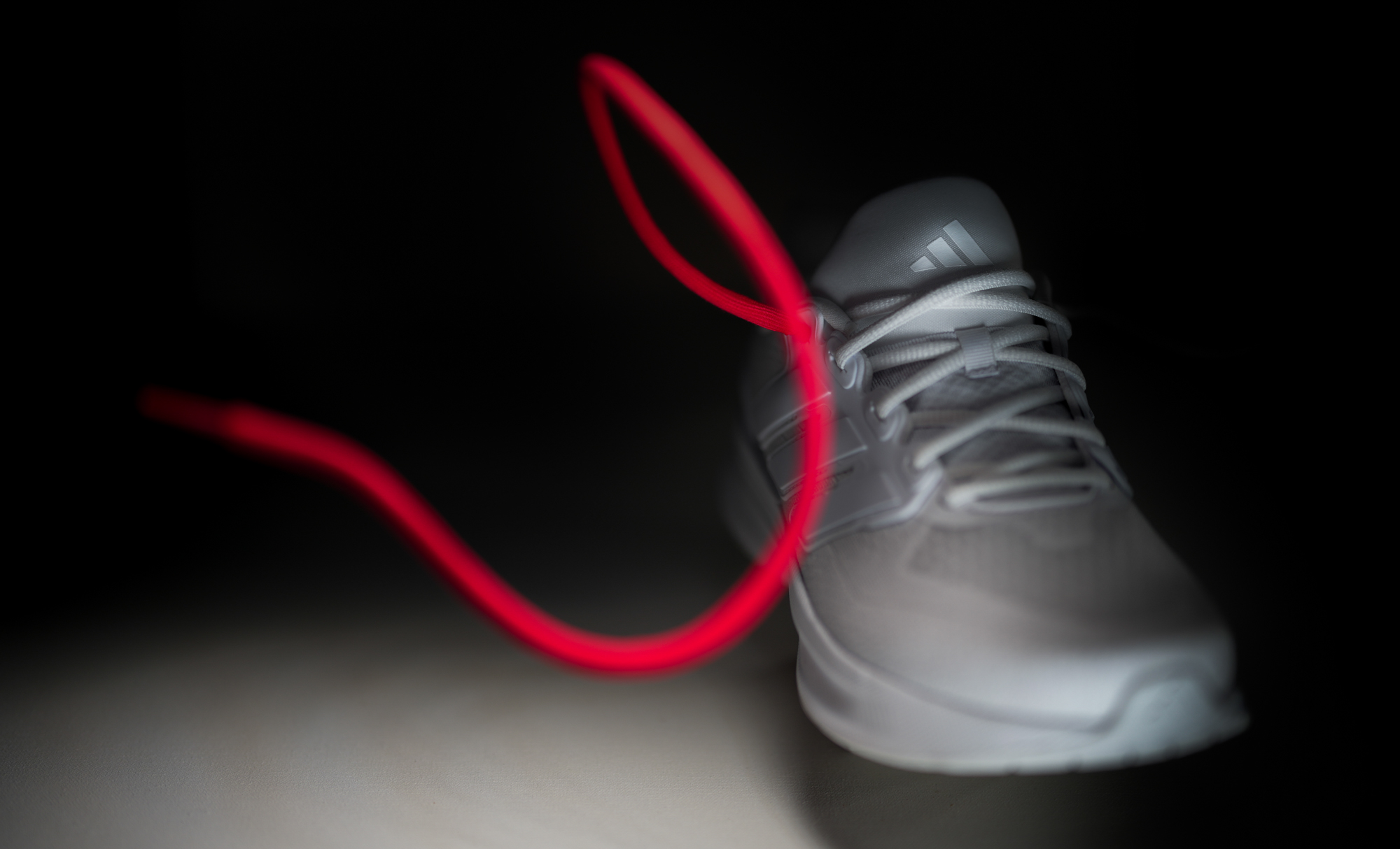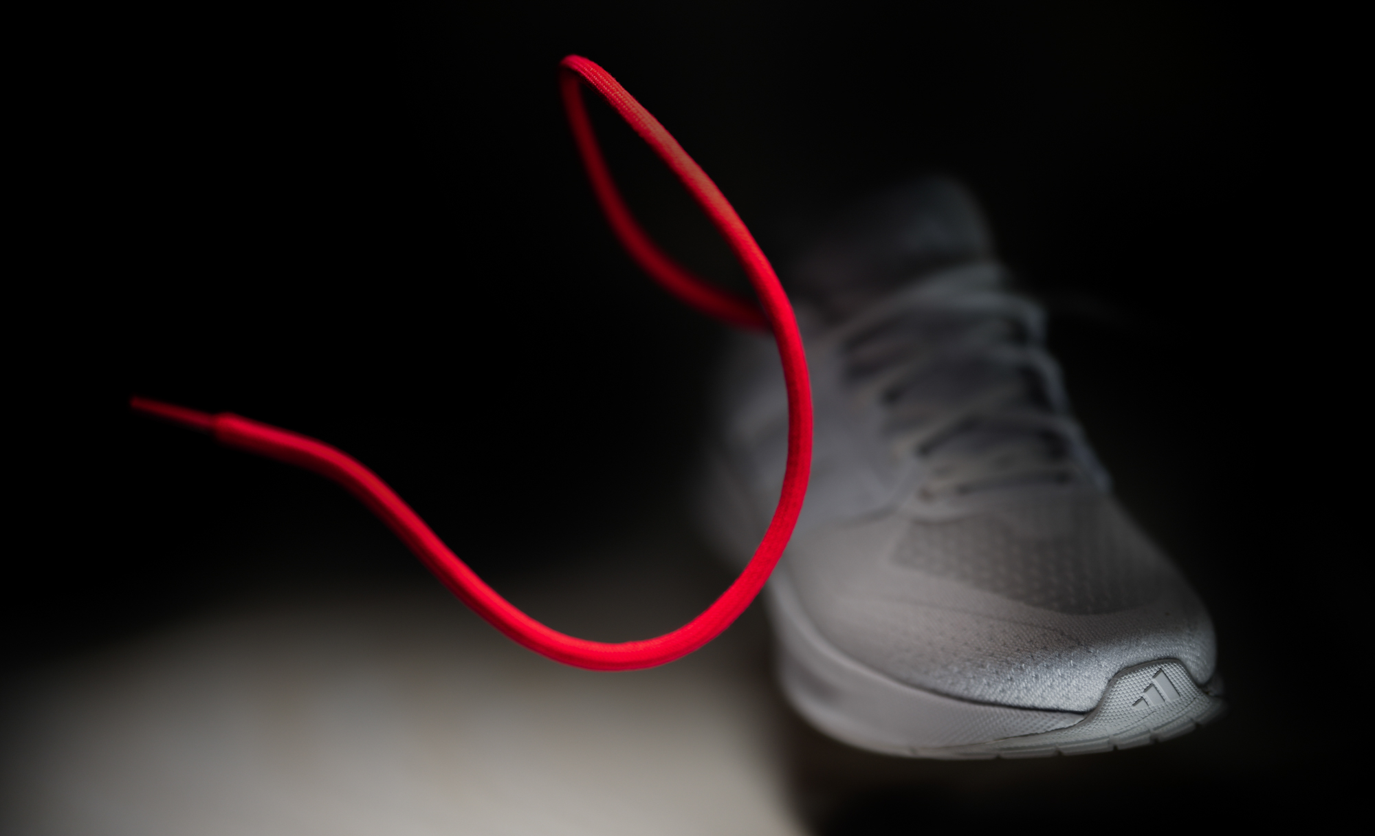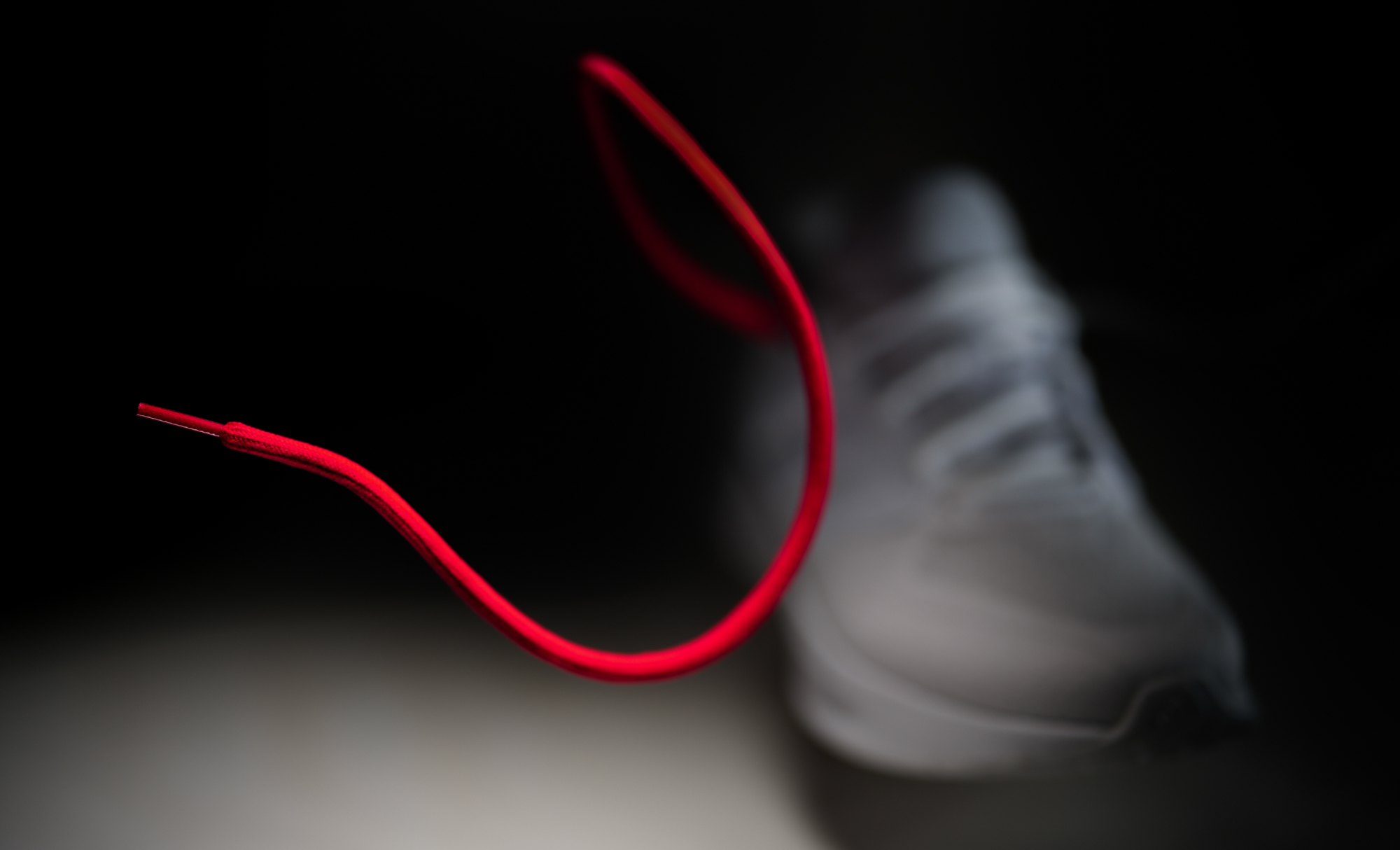 Zunächst eine Fotografie mit einem Schuh und Schnürsenkel auf sehr dunklem Hintergrund, ohne weitere Requisiten und sehr minimalistisch fotografiert, wobei die Gestaltung nur durch den besonderen Schwung des Schnürsenkels bestimmt ist. Auch hier ist nur das Ende des Schnürsenkels mit sehr geringer Tiefenschärfe abgebildet.