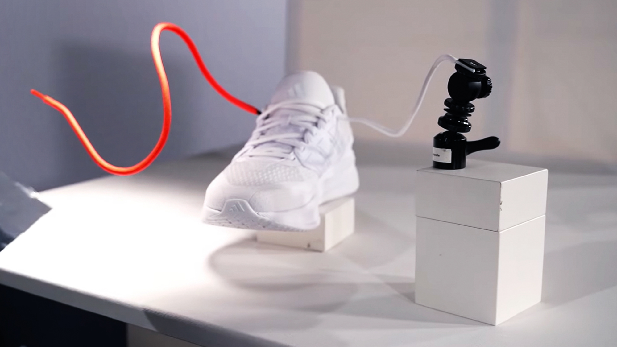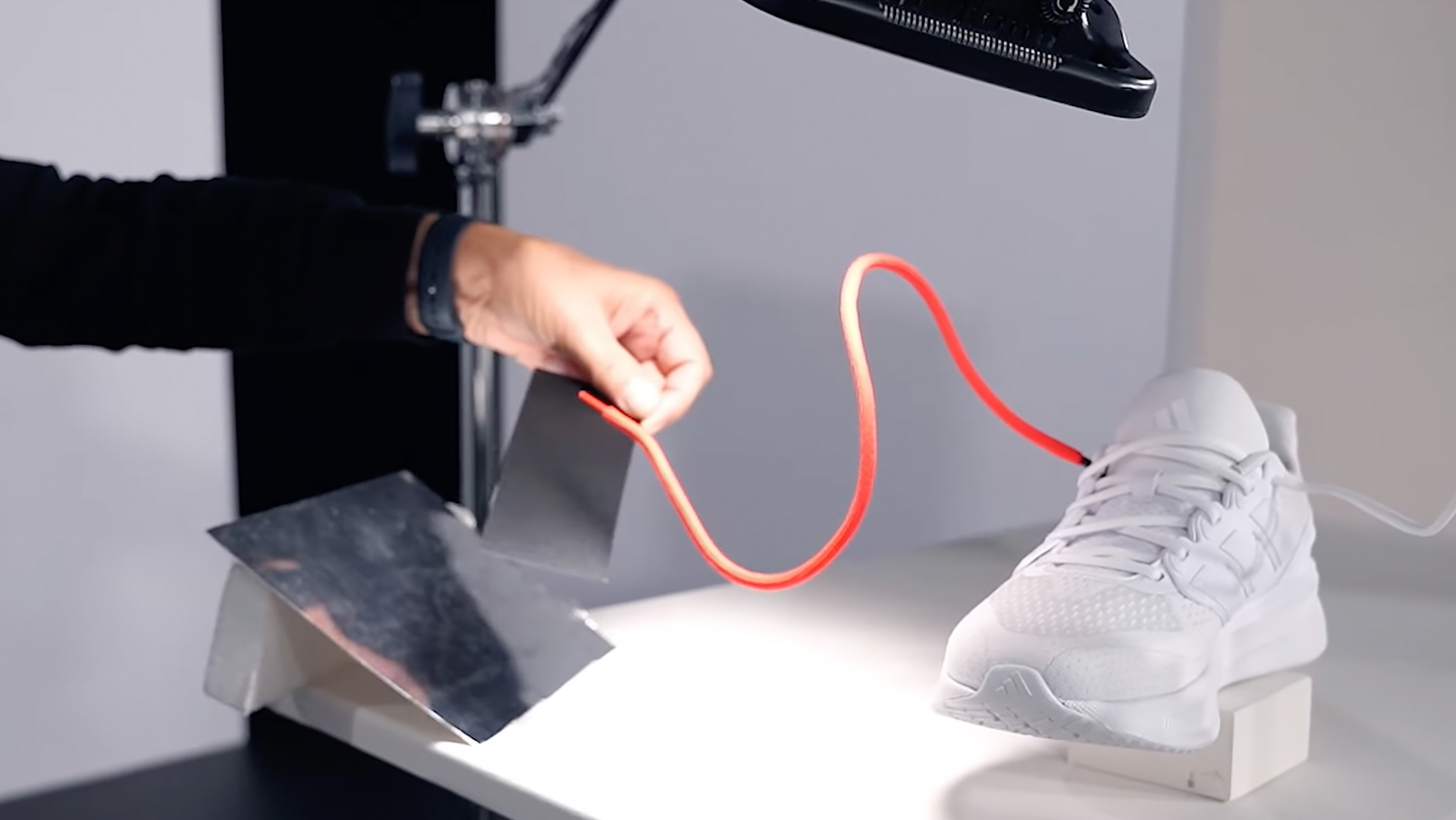 So ist der Schnürsenkel schnell präpariert. Ich habe einen starken Draht eingefügt und kann diesen bereits vorab ziemlich genau nach meinen Vorstellungen biegen. Mit etwas Erfahrung in der Stilllifefotografie erklärt sich nun der Setaufbau fast von selbst.