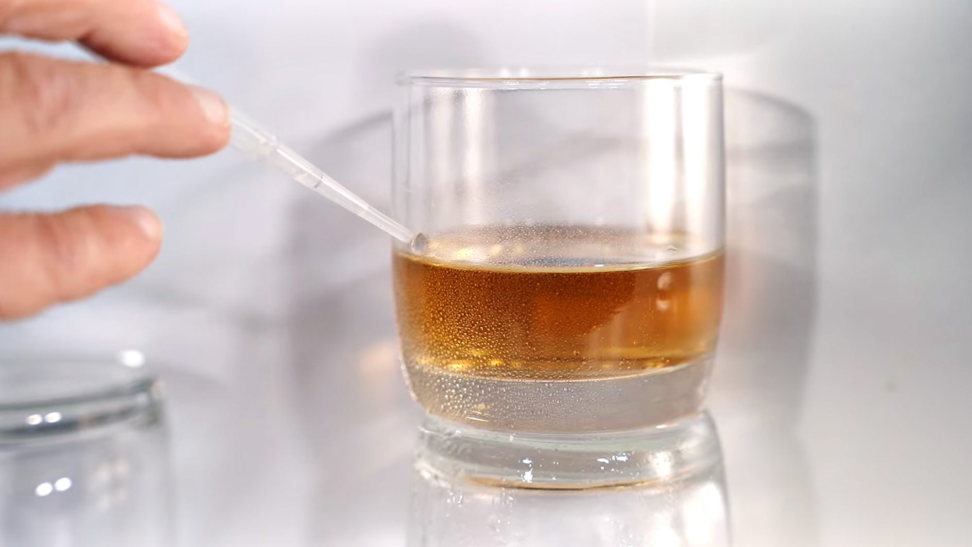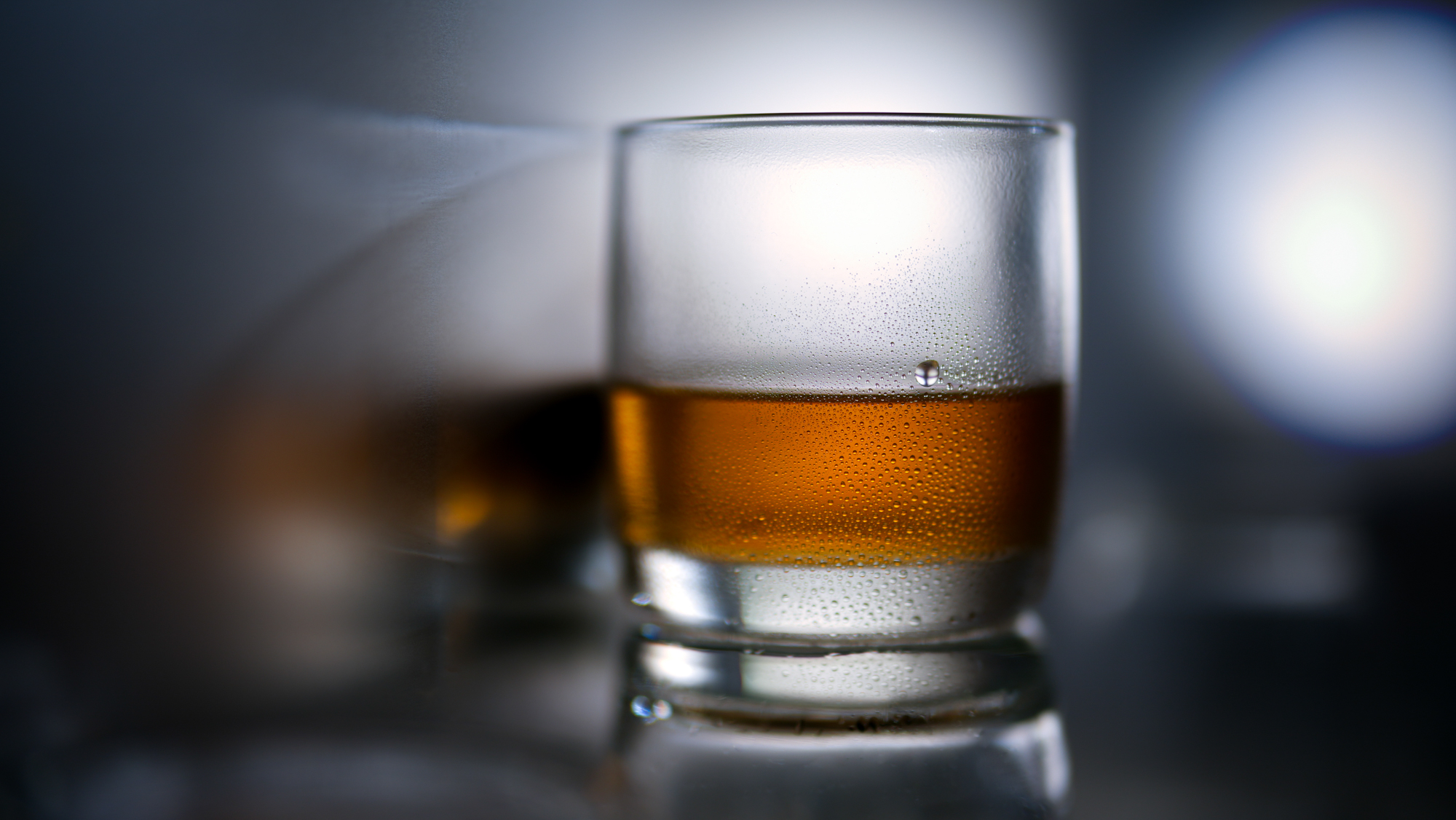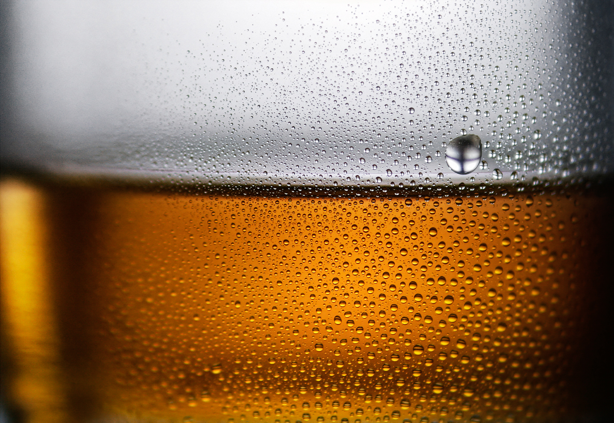 Eine zweite Fotografie sollte eine angedeutete, atmosphärische Aufnahme mit einem Getränk sein. Der unscharfe Hintergrund könnte einer Lifesituation entsprechen. Das Glas wird, nur auf einen Tautropfen fokussiert, so fotografiert, dass bereits ein flüchtiger Blick reicht, um dort einen klaren Blickfang zu generieren.