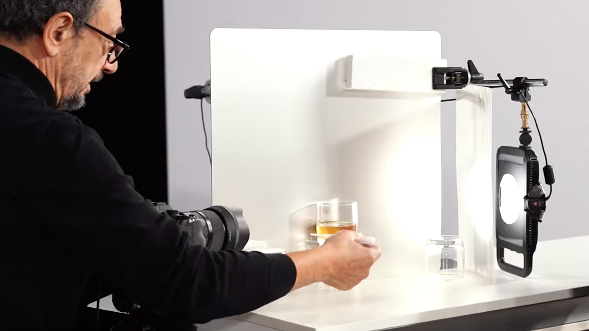 Bei dieser Aufnahme kommt etwas mehr Atmosphäre ins Spiel. Mit einem matten Spiegel links im Bild und dem sichtbaren Hintergrundlicht rechts entsteht eine fast räumliche Abbildung.