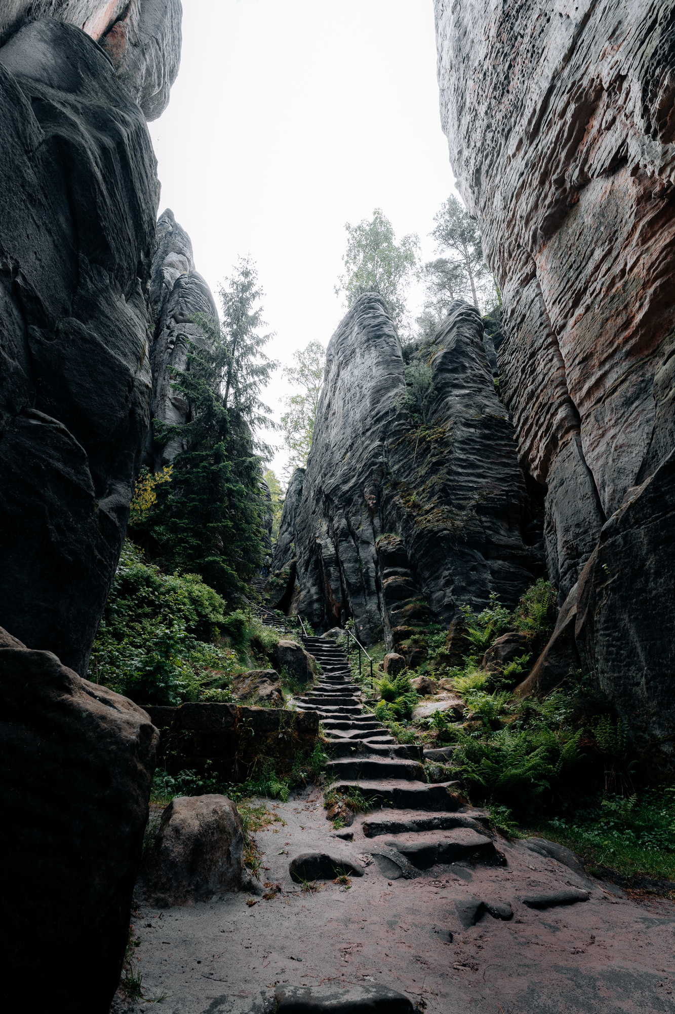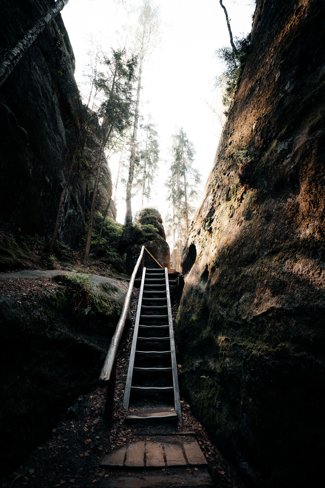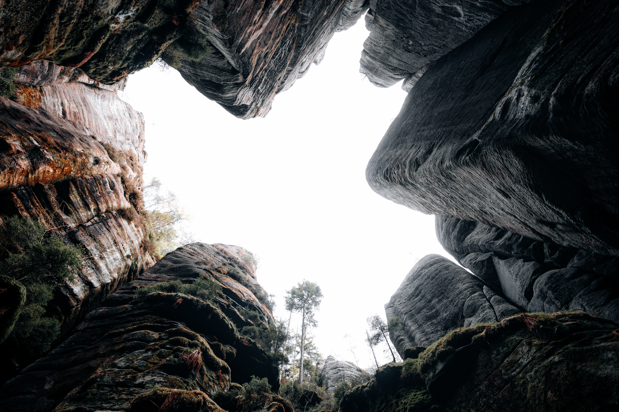 Der wahre Höhepunkt war jedoch, wenn ich nach oben blickte. Inmitten der schroffen Landschaft und umgeben von uralten Bäumen konnte man fantastisch mit der Perspektive spielen. Es war ein bisschen wie das Eintauchen in eine andere Welt, wo jeder Blick nach oben die beeindruckende Größe und Majestät der Natur auf eine neue Weise erlebbar machte. Und genau das war es, was ich an diesem Objektiv so liebte: Mehr Perspektive, ohne den ganzen Schnickschnack eines Zoomobjektivs. Und wenn man mal zu nah oder zu weit weg war, musste man einfach ein paar Schritte vor- oder zurückgehen, bis der Bildausschnitt passte. Egal ob bei den mystischen Suché skály oder den beeindruckenden Teplické skály – die Weitwinkelaufnahmen dieses kompakten, aber leistungsstarken Objektivs waren perfekt geeignet, um die Magie dieser Felsenlandschaften einzufangen.