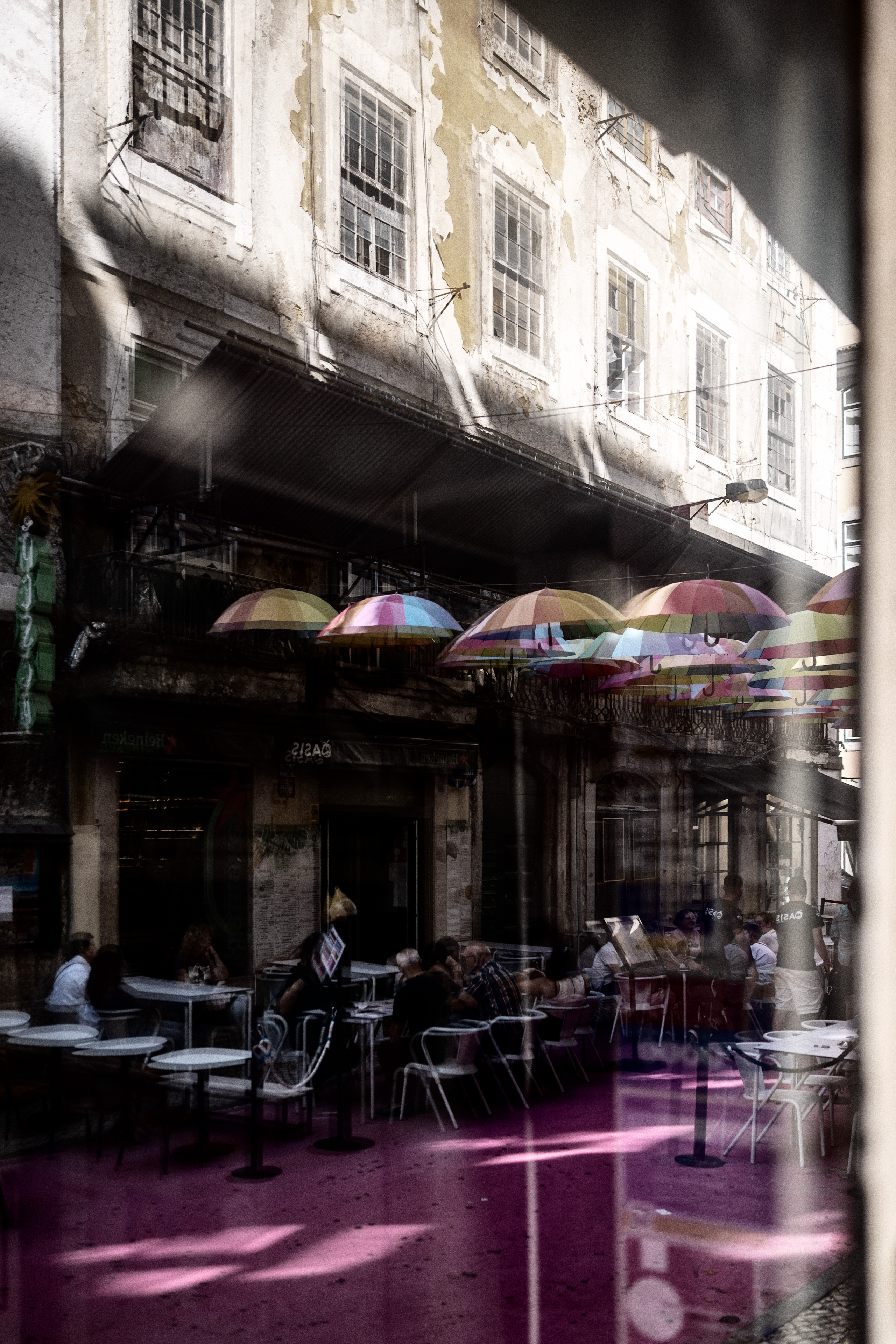 Natürlich wollten wir auch die bekannte Rua Nova do Carvalho sehen, besser bekannt als „Pink Street“ oder „Umbrella Street“. Um ehrlich zu sein waren wir zunächst etwas überrascht, wie klein diese Straße eigentlich ist. Um uns herum viele Touristen, die Fotos machten. Nun – ich war ja selbst auch Tourist. Also suchte ich nach einer anderen Perspektive und entdeckte schnell die Spiegelung in einer Fensterscheibe. Daraus entstand das Bild mit den Schirmen. Sicher kein völlig neuer Ansatz und bestimmt schon oft fotografiert – aber eben noch nicht von mir.