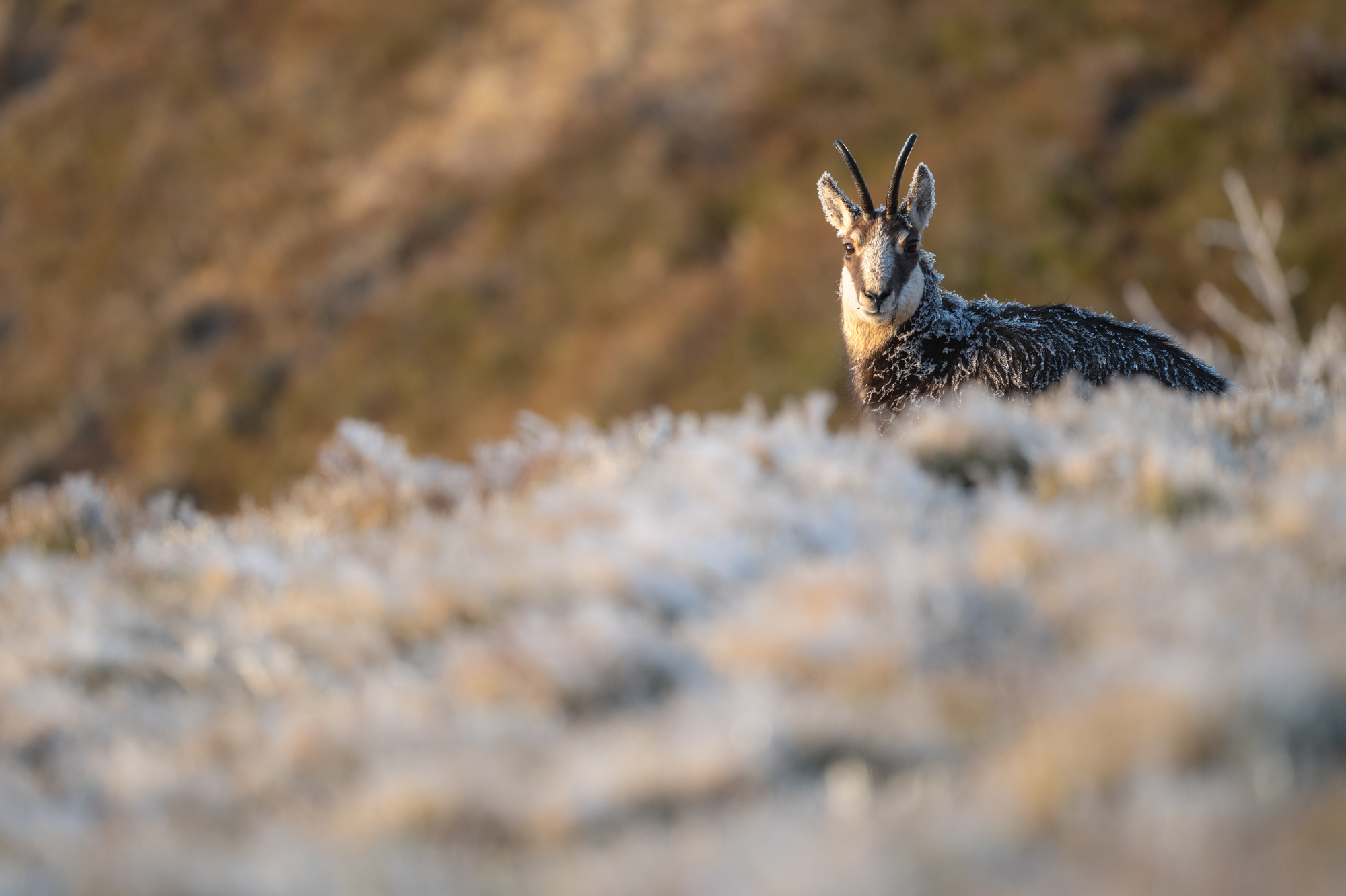 Erst als die Sonne sich langsam ihren Weg durch die dichten Nebelschwaden gebahnt hat, entdecke ich eine kleine Herde vor mir in einer windgeschützten Bergflanke wie sie das Eis von den Gräsern lutschen.
