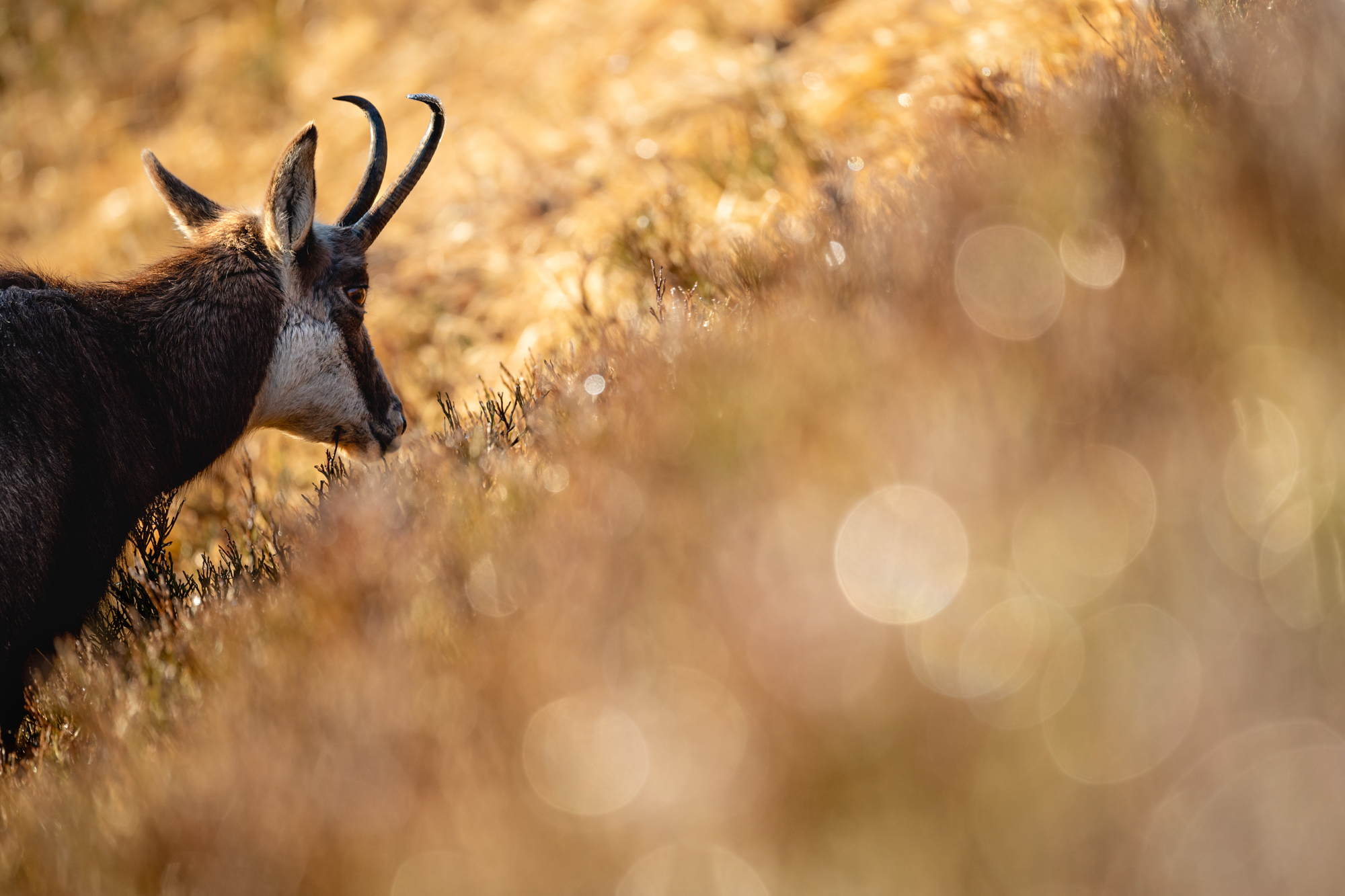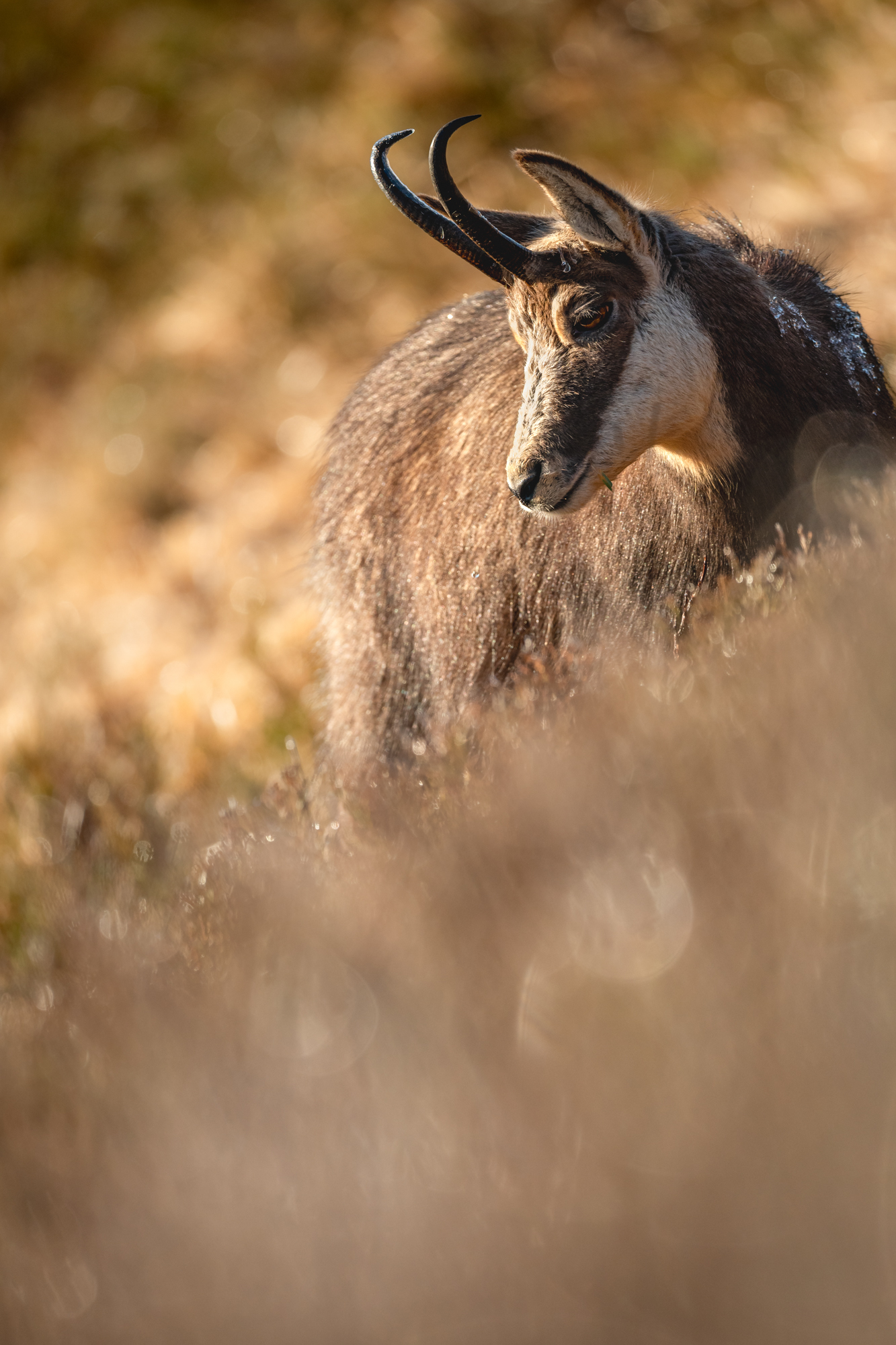 Die Gämsen lassen es gemütlich angehen, immer wieder muss ich meine Kameraposition lange (aus)halten, bis sich der Kopf mal aus der Vegetation erhebt. Für Autofokus alles kein Problem und ein Druck auf die Anzeigetaste der Kamera verrät mir, dass die Schärfe absolut überragend ist und hier keinerlei Abstriche gegenüber den großen, schweren Super-Tele gemacht wurden, um dieses niedrige Gewicht zu erreichen.