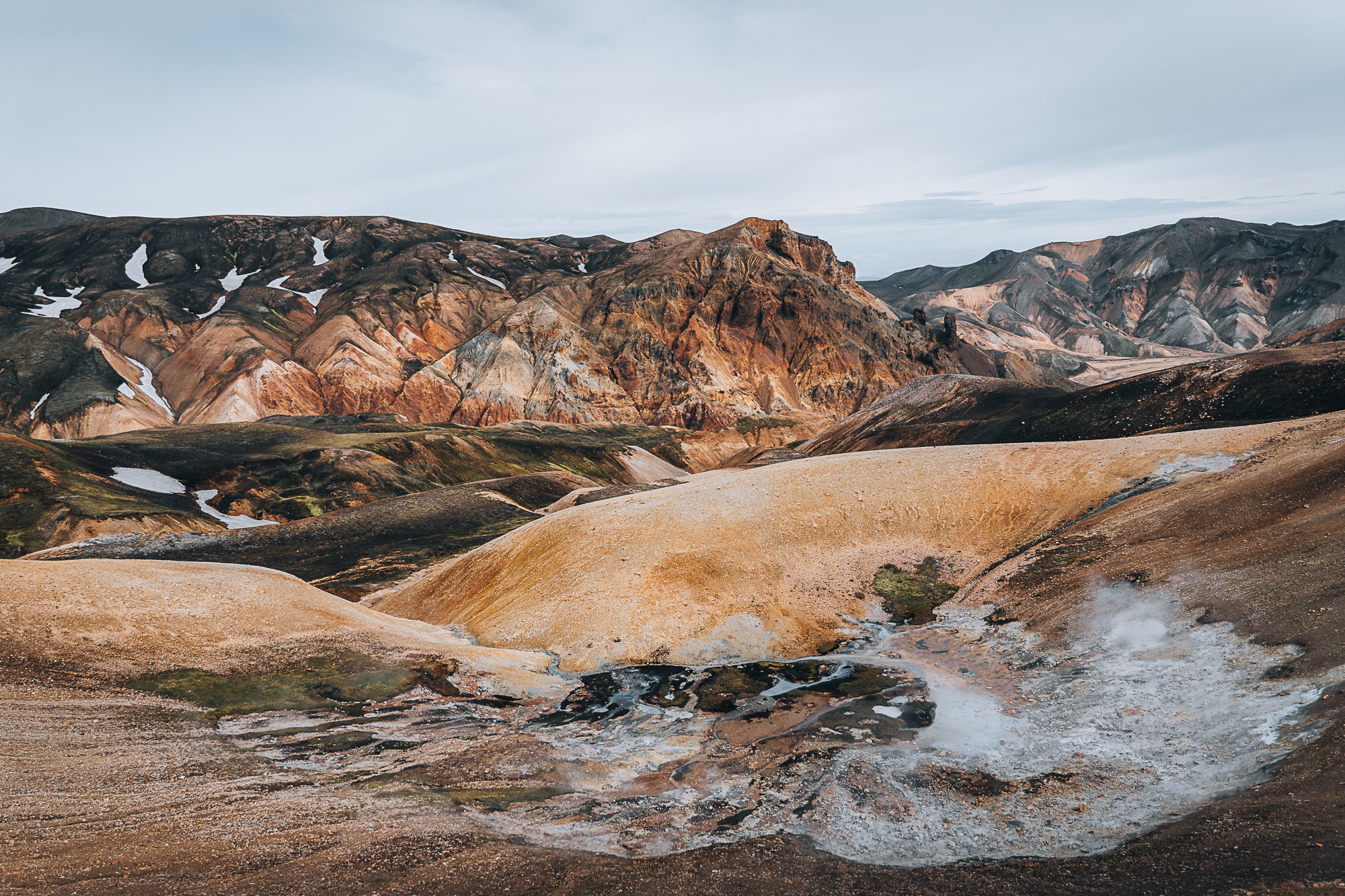 Das spannende an Island ist jedoch, dass es auch noch andere Vulkansysteme gibt. So waren wir unter anderem im Hochland in Landmannalaugar. Hier formt das Vulkansystem des Torfajökull die Landschaft und es gibt verschiedene Vulkane wie den Bláhnúkur und den Brennisteinsalda. Die Berge in dieser Gegend sind unfassbar bunt. Diese Farben kommen durch unterschiedliche Chemische Stoffe und bewuchs zustande, unter anderem Schwefelablagerungen, Eisen, Basaltgestein, Pechgestein, Trachyt, Rhyolith und Kalk, sowie Moos, welches an den Hängen wächst.