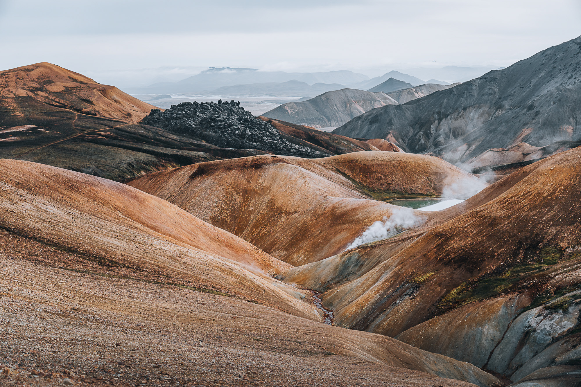 Die Gegend um Landmannalaugar herum ist auch vulkanisch aktiv, was man unter anderem an dem strengen Schwefelgeruch merkt, der insbesondere in der Nähe der dampfenden Stellen in der Luft liegt.