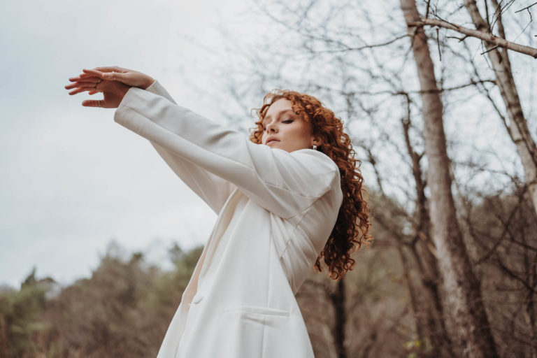 Dass man aber auch wunderbar draußen fotografieren kann, sieht man in meinem anderen Shooting mit Marie in der wunderschönen Natur. Die winterlichen Braun- und Orange-Töne passten einfach auch super zu den mega Haaren von Marie, oder? Für einen Kontrast zur Natur hatte ich ein cooles monochromes Outfit in weiß für mein Model gewählt.