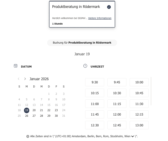 Wir nehmen uns gerne Zeit für Sie. Um Sie kompetent beraten zu können, ist daher eine vorherige Terminvereinbarung notwendig, unangemeldete Besuche unseres Showrooms sind leider nicht möglich. Ihren persönlichen Besuchstermin können Sie ganz einfach und bequem online reservieren: